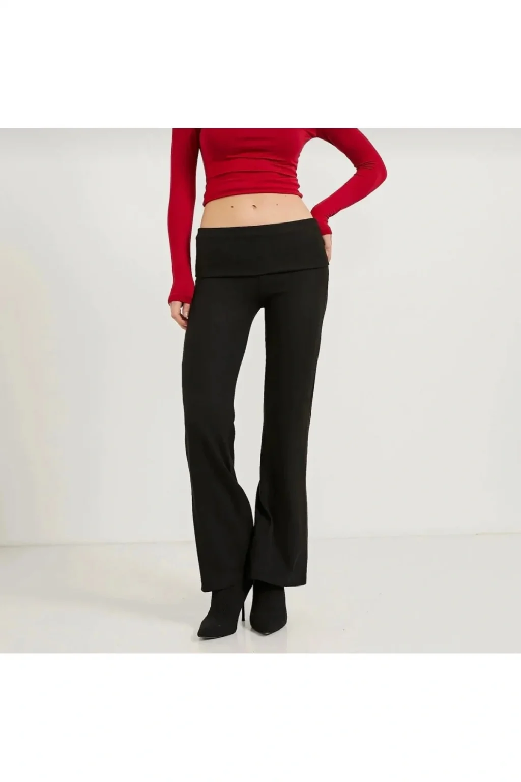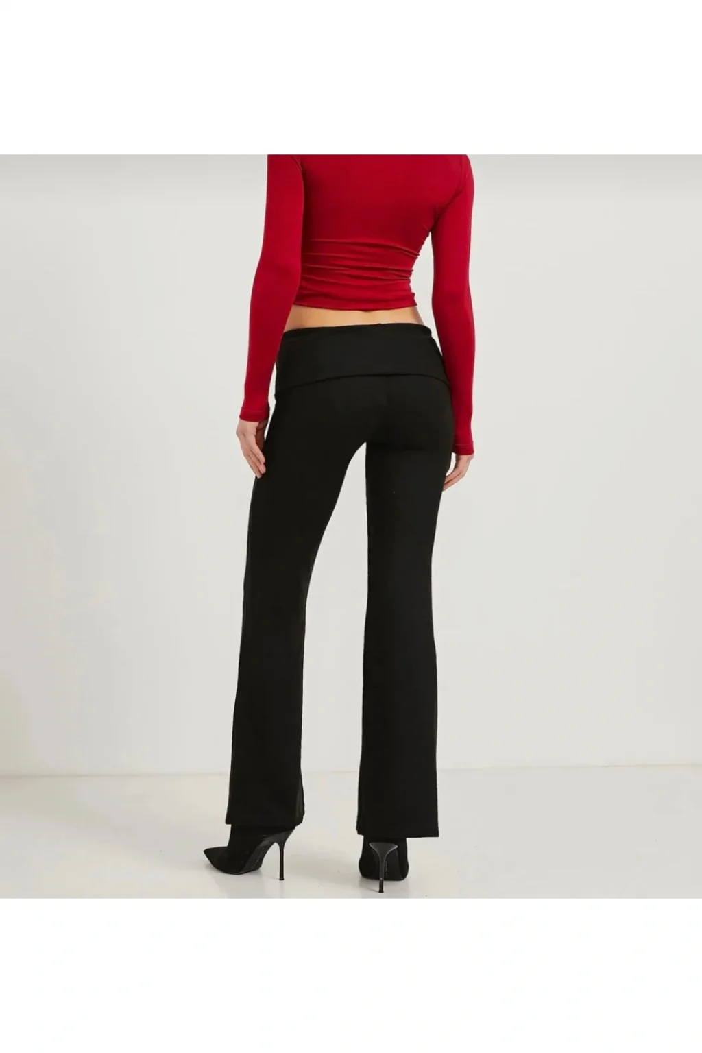 Siyah Katlanmış Bel Bantlı İspanyol Paça Pantolon
