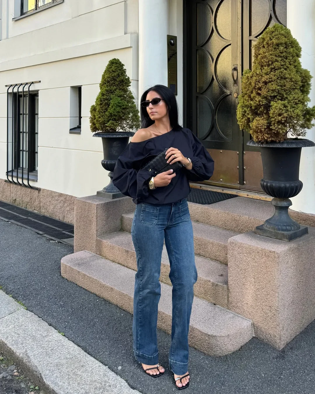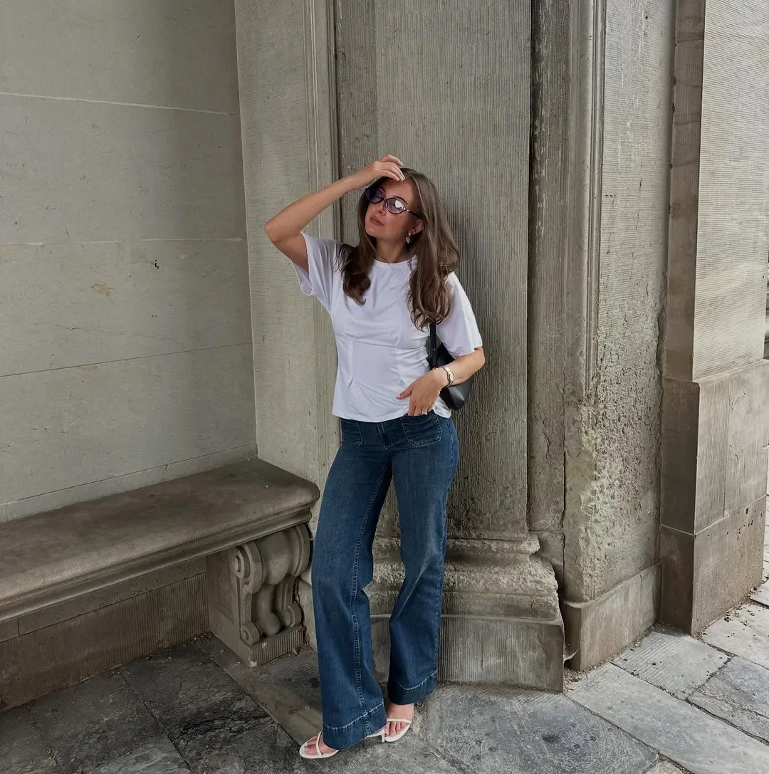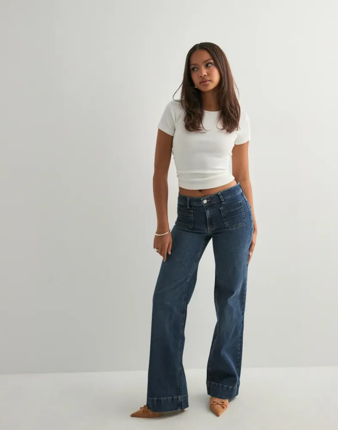 Slim bootcut form, diz hizasından itibaren açılan kesimiyle bacak boyunu optik olarak uzatır.