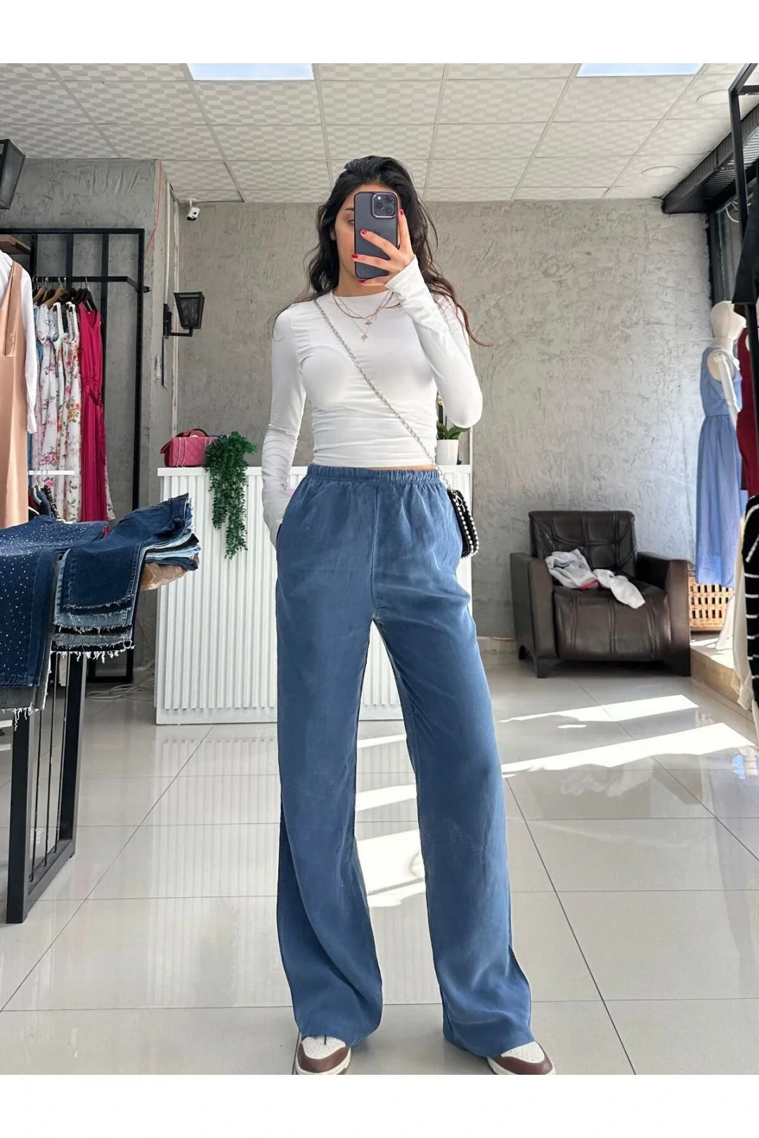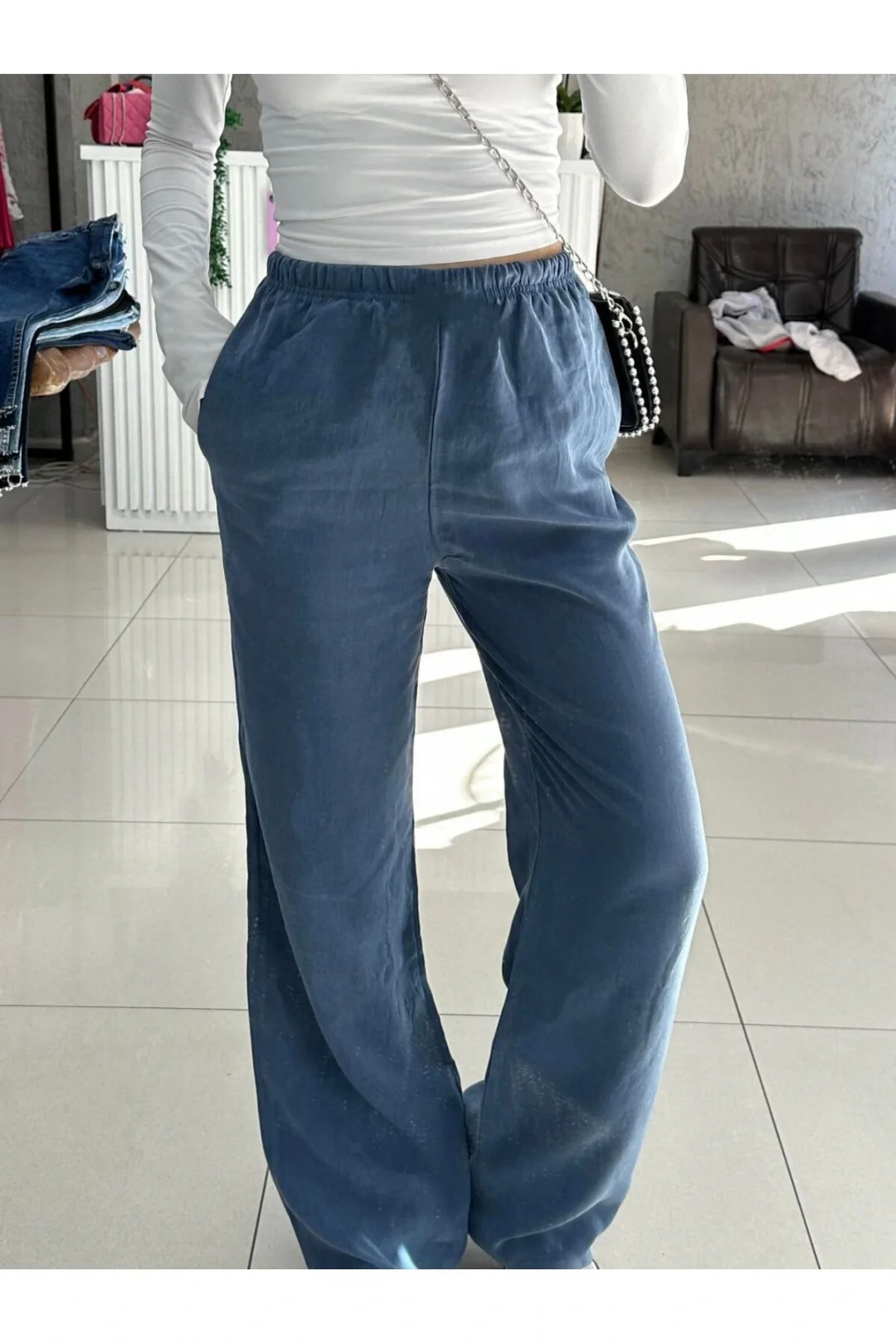 Lastikli İnce Saten Kumaş Rahat Bol Paça Cepli Pantolon