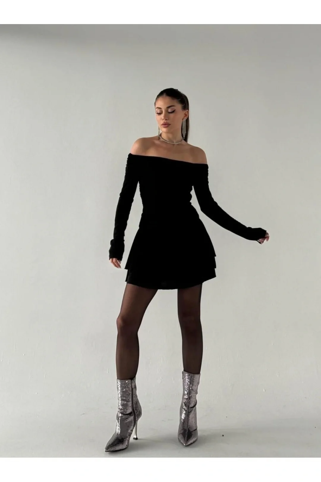 Kadın Kemer Detaylu Omuz Dekolteli ve Bel Vurgulu Mini Elbise Şık Fit Model