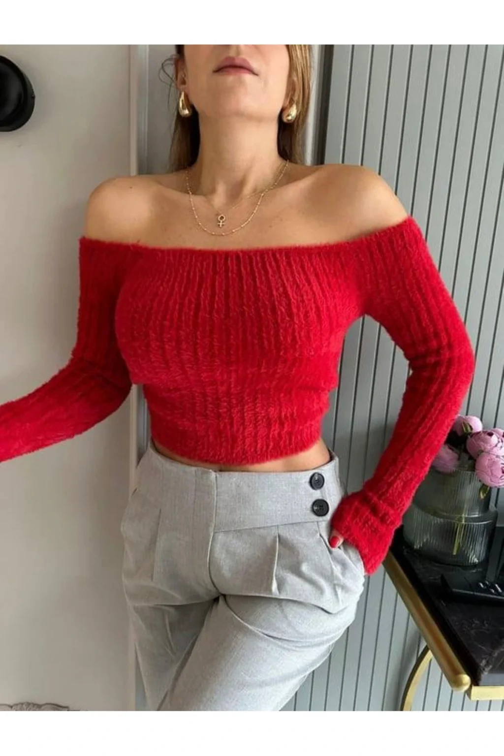 Lacivert Kayık Yaka Uzun Kollu, Rahat Fit Omzu Açık Kadın Crop Kazak