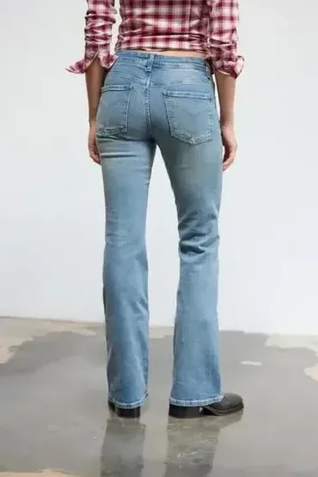 Şık ve Rahat Tasarım: Mavi Bootcut İspanyol Paça Düşük Bel Jean, modern ve vintage tarzını birleştirerek şıklığınızı ön plana çıkarır. İspanyol paça kesimi, bacaklarınızı uzun gösterirken rahat bir kullanım sunar.