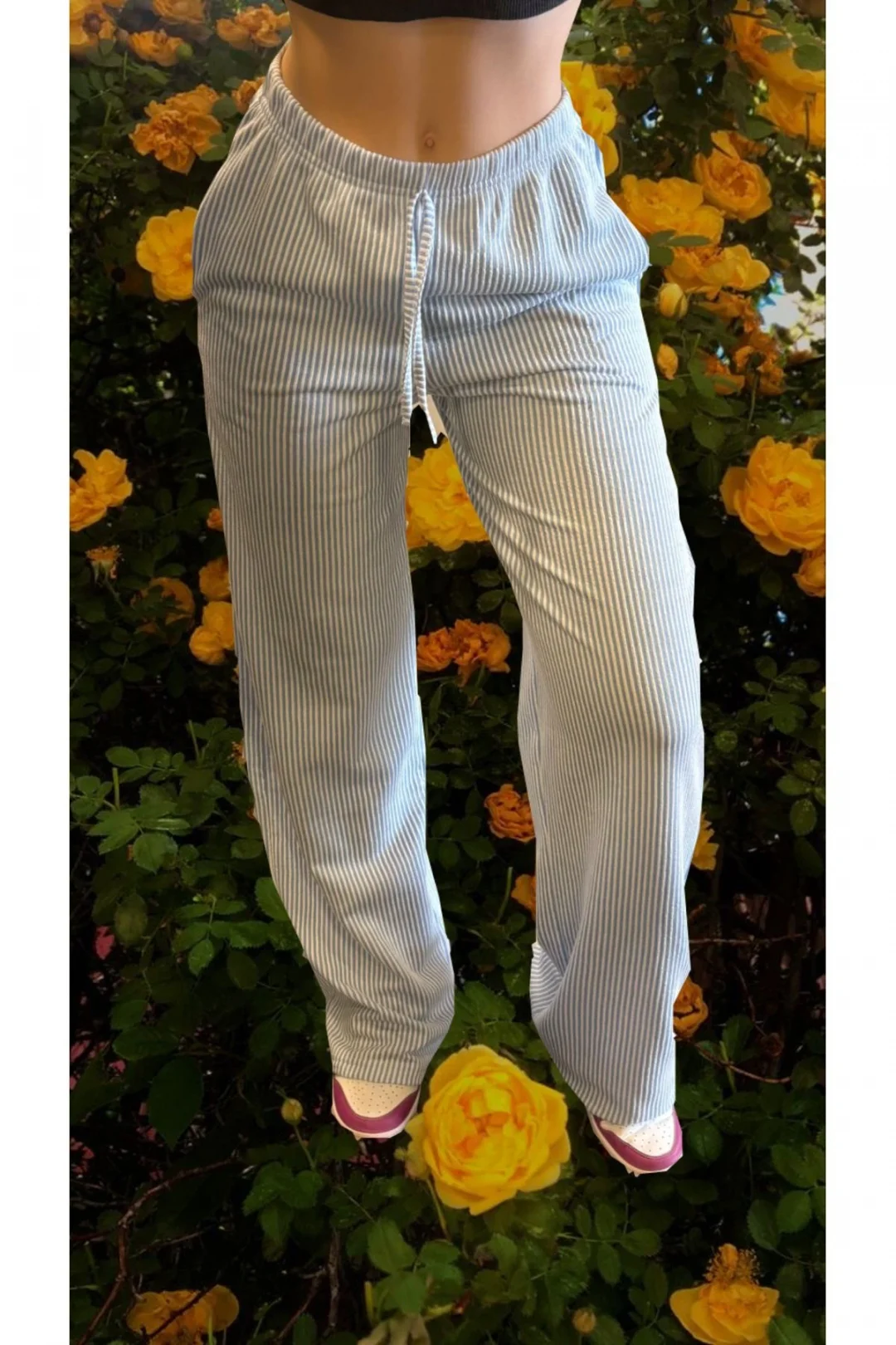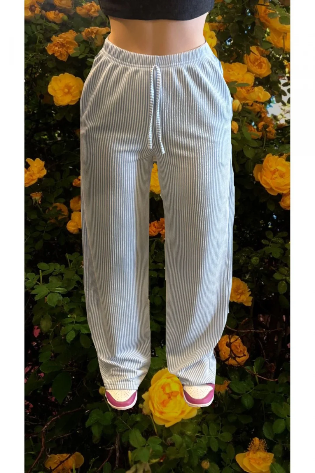 - Yaz aylarının vazgeçilmezi, hafif ve rahat bir kullanım sunan mavi çizgili pamuk pantolon.; - Esnek yapısı sayesinde gün boyu konforlu bir deneyim sağlar.; - Astarsız tasarımı ile hafif ve ferah bir hissiyat yaratır.; - Cool & comfort persona'sına uygun olarak tasarlanmıştır; hem şık hem de rahat bir görünüm sunar.; - Wide Leg siluetiyle modern ve trend bir tarz sergiler.; - İki cep detayı pratik kullanım imkanı tanırken, ince kalınlığı yaz sıcağına karşı idealdir.; - Dokulu dokusuyla göz alıcı bir stil oluştururken, genç yaş grubuna hitap eder.; - Normal bel yüksekliği ile gün içindeki hareket özgürlüğünüzü kısıtlamaz.; - Uzun boy kesimi sayesinde bacakları olduğundan daha uzun gösterir.; - Bol paça tasarımı modern ve dinamik bir görünüm kazandırır.; - Çizgili deseniyle zamansız bir şıklık sunarken, bol kalıp rahatlıkla kombin yapmanızı sağlar.; - Pamuklu materyali tercih edilerek cildinizin nefes almasına olanak tanır.; - Trend ortamlarda dahi stil sahibi görünmenizi sağlayacak detaylara sahiptir.; - Menşei Türkiye'de üretilmiştir; yerel üretim avantajlarından faydalanabilirsiniz.;