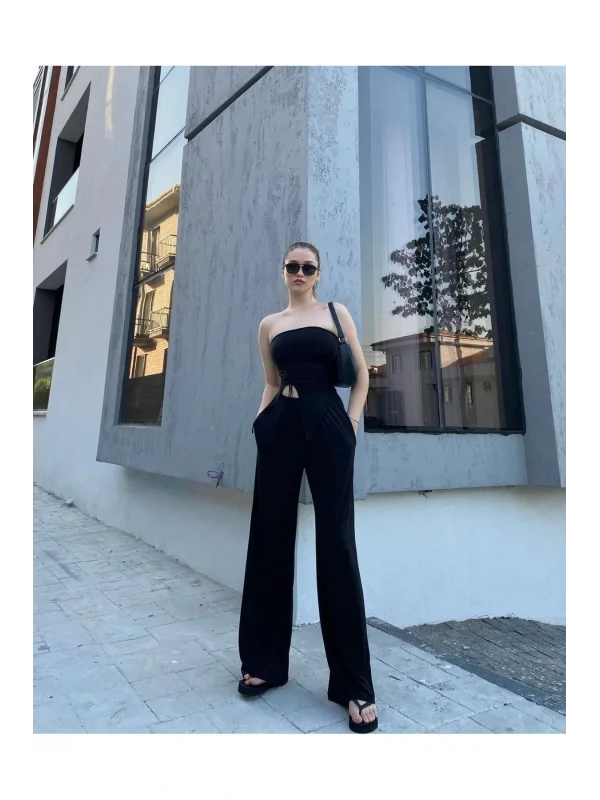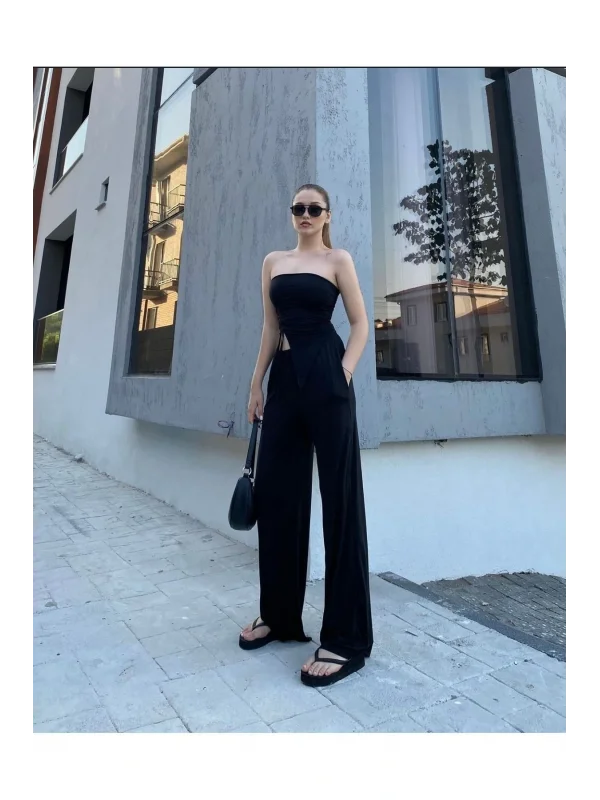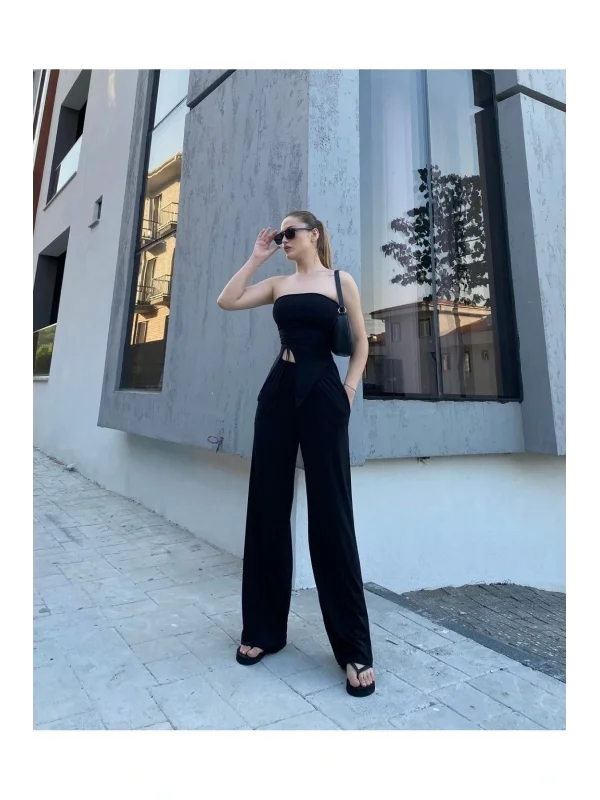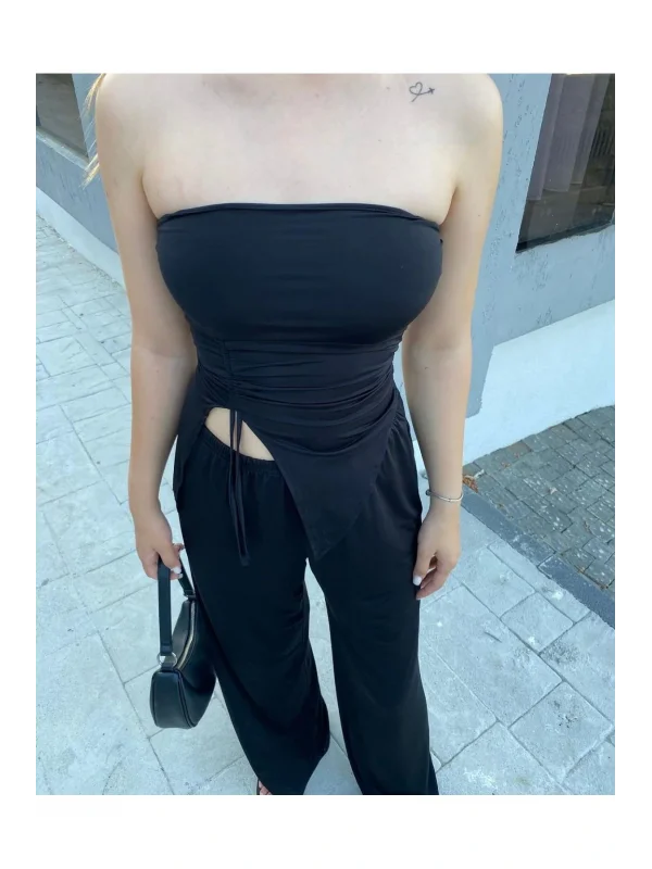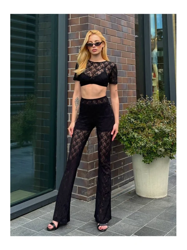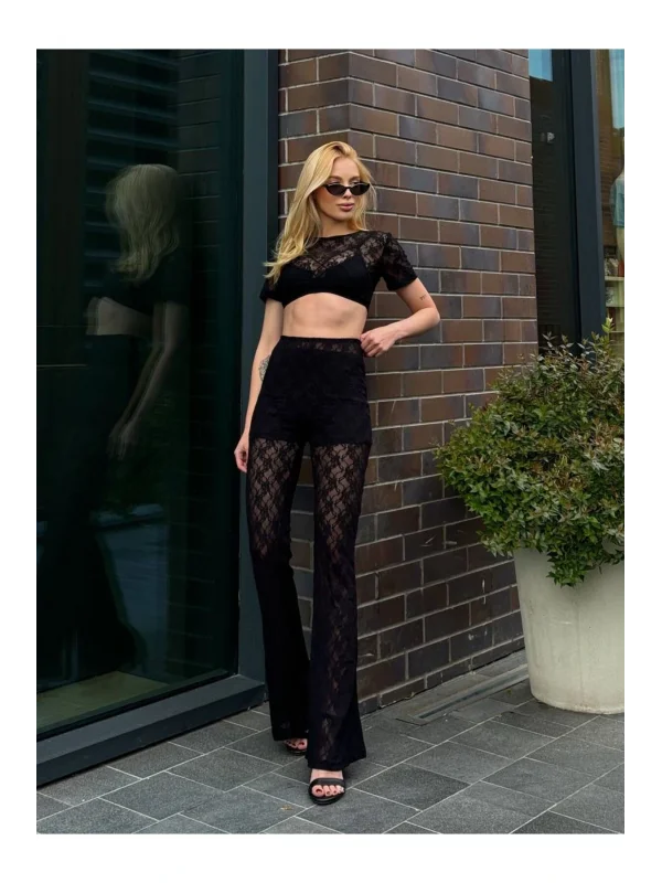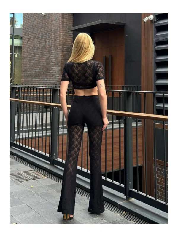Dantel Crop Pantolon Şortlu Siyah Takım