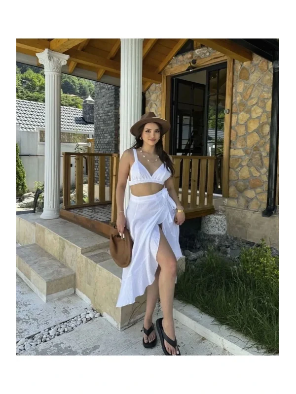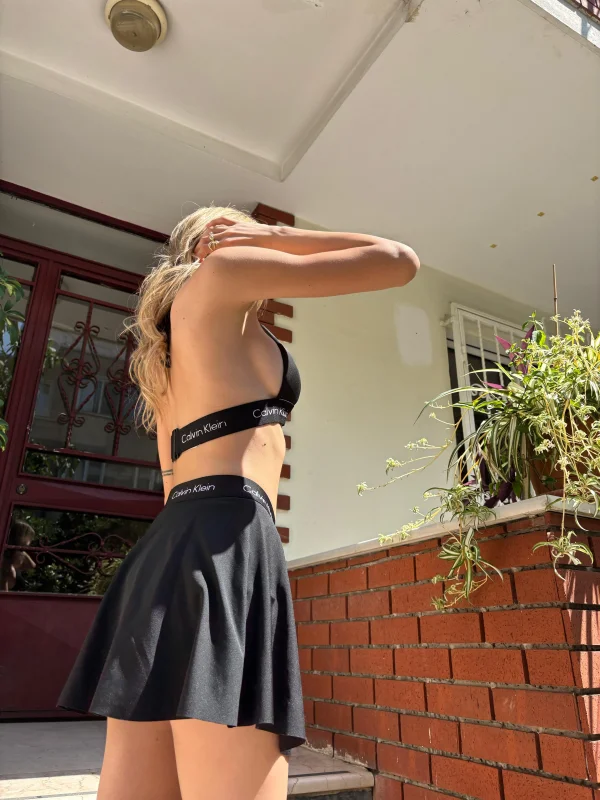 Siyah Şort Etekli Takım Marka Muadil Halter Bralet ve Mini Etek Takımı Logo Lastikli İki Parça Set