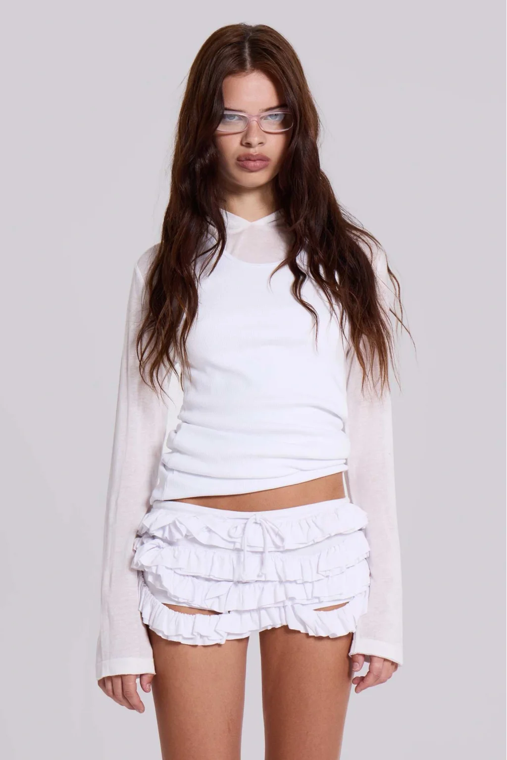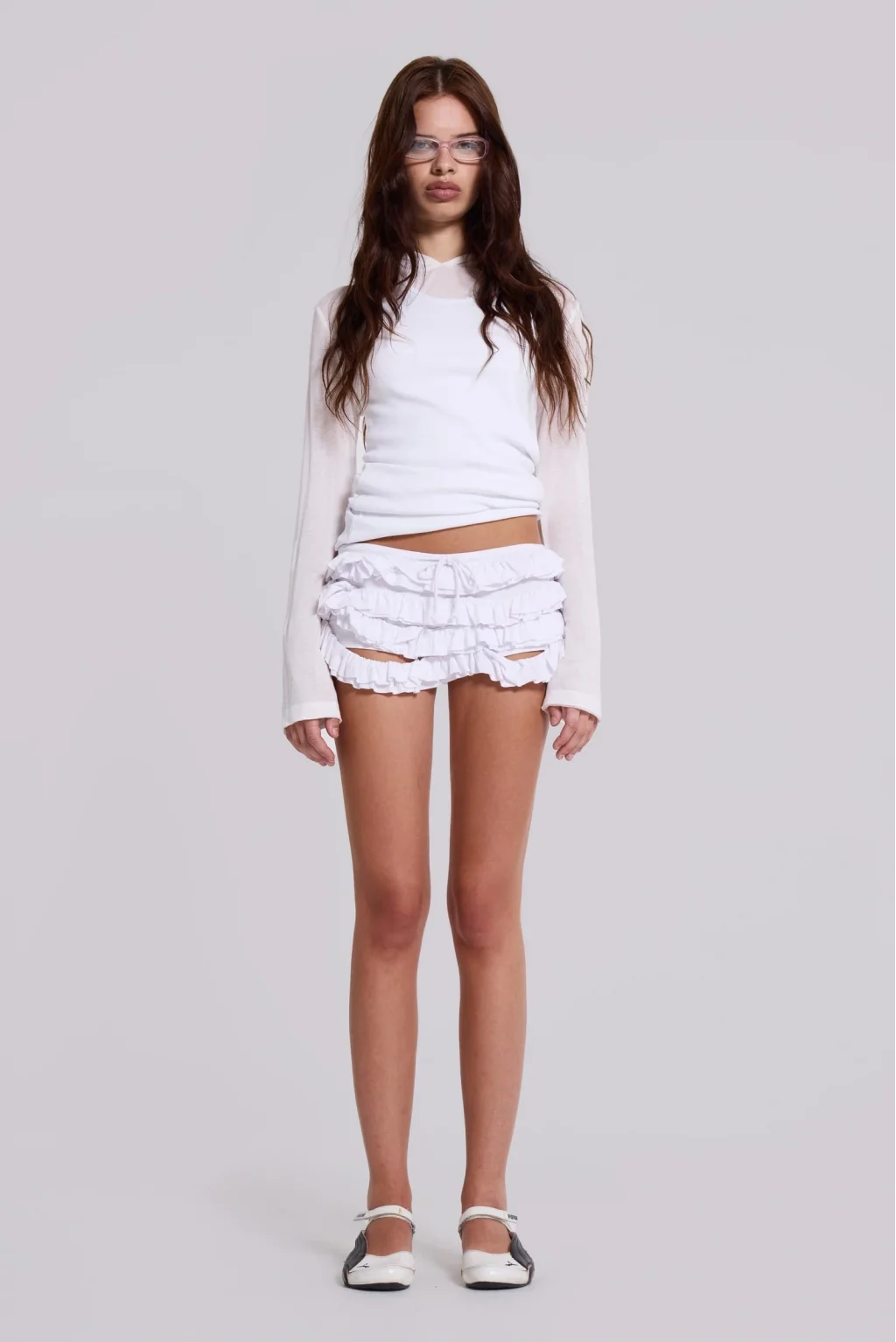 JD Y2K Dekonstrü Fırfırlı Beyaz Bloomers Mini Şort, günlük kullanımdan özel davetlere kadar birçok farklı kombinle şıklığınıza şıklık katar.