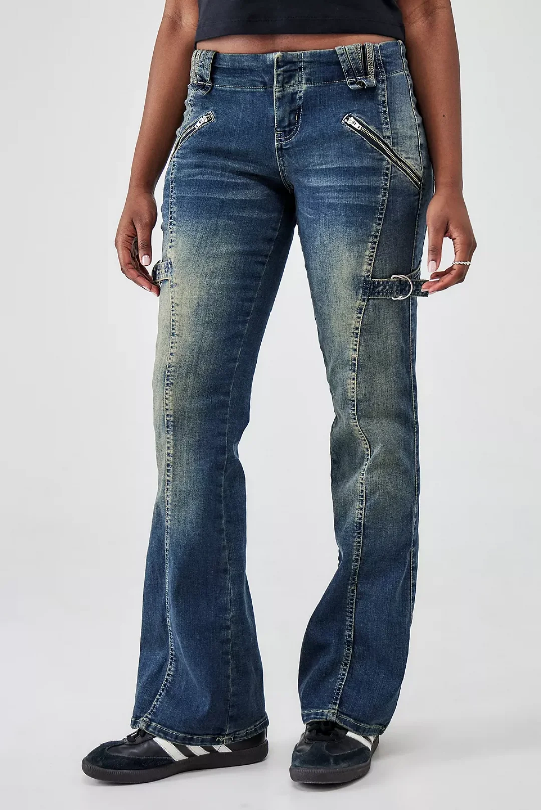Detay: Çapraz fermuarlı cep tasarımı, yan halka aksesuar, yıpratmalı görünüm