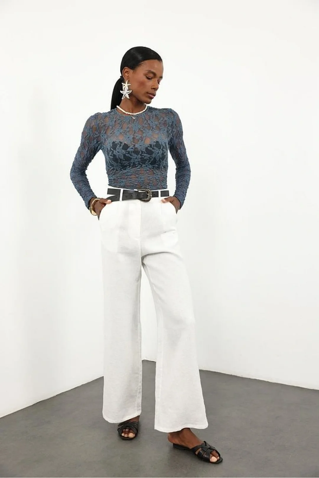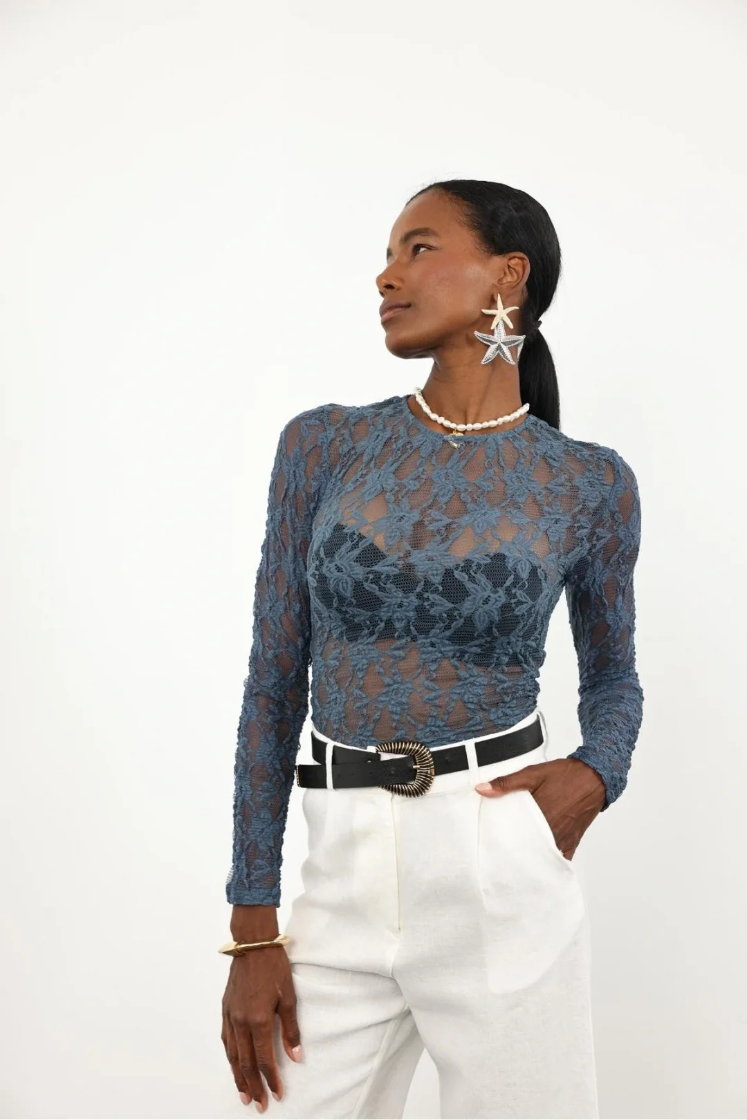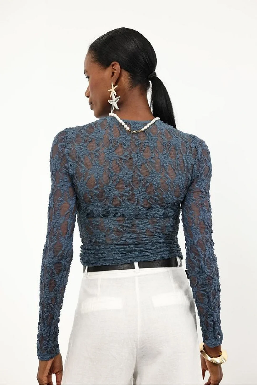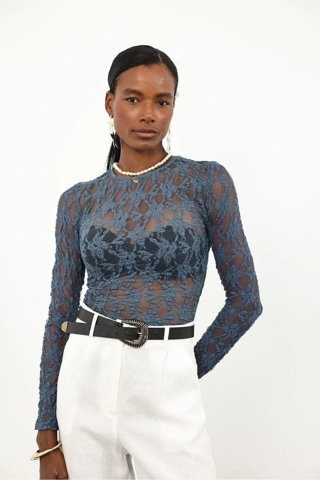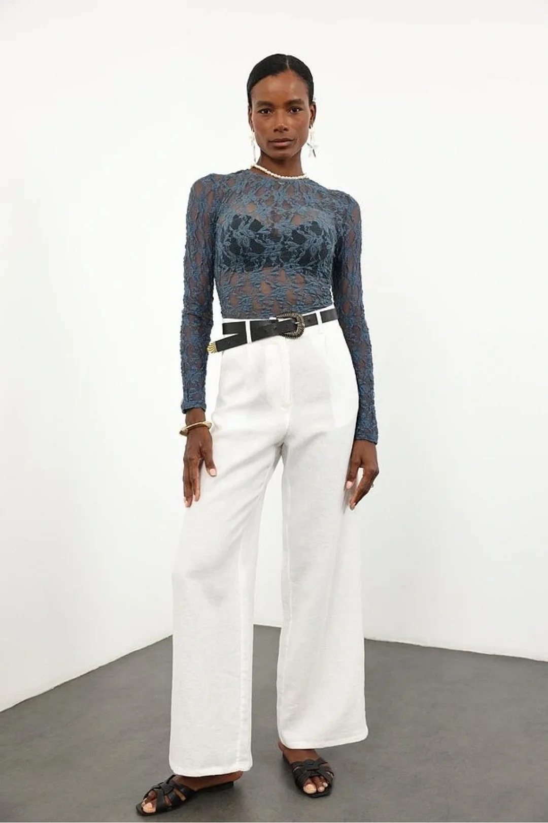 Petrol Mavisi Dantel Uzun Kollu Bluz ile şıklığı ve rahatlığı bir arada yaşayarak her ortamda göz kamaştırıcı bir görünüme sahip olabilirsiniz.