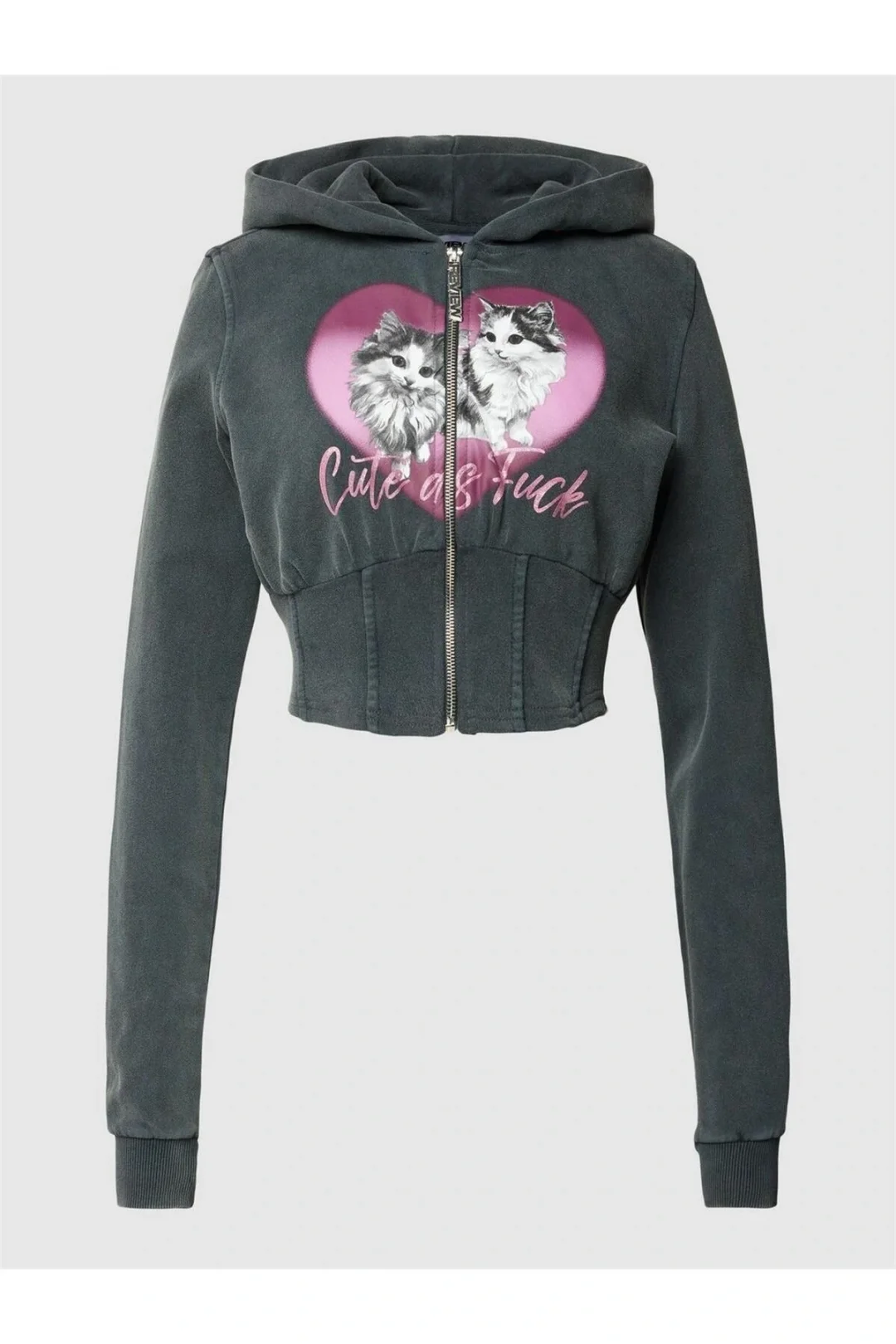 Retro Kedili Fermuarlı Crop Sweatshirt
