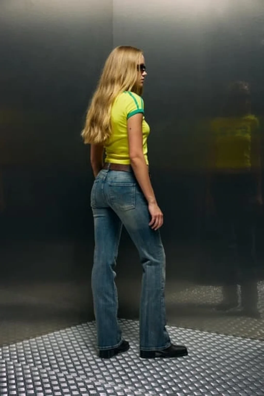 Modern ve Şık Bootcut Tasarımı: Soluk mavi tonlarında tasarlanmış bootcut ispanyol paça düşük bel jean, özgün ve rahat bir stil sunar. İspanyol paça kesimi, bacaklarınızı daha uzun gösterirken aynı zamanda hareket özgürlüğü sağlar.