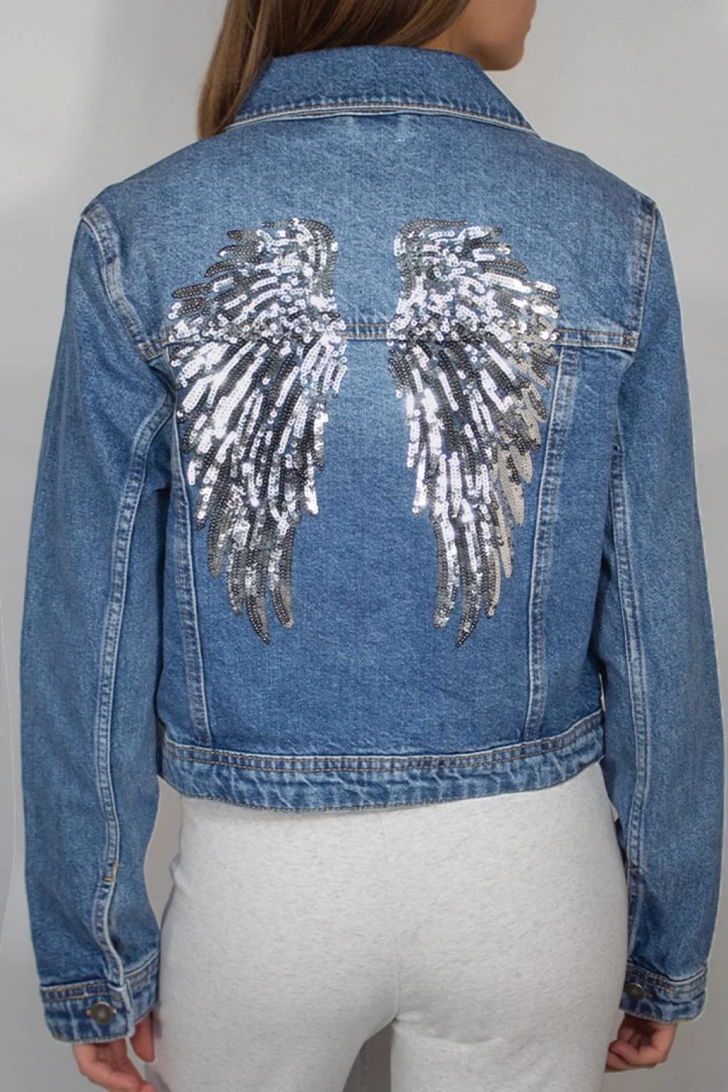 Payetli kanatlı ceket, kot rengi, yaka, düğmeli, uzun kollu, normal uzunluk, rahat kesim.