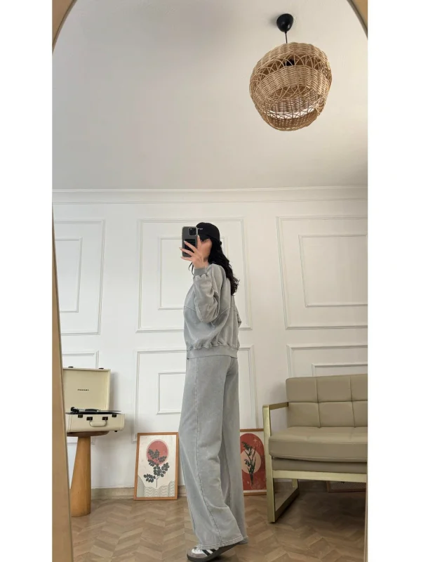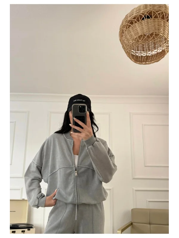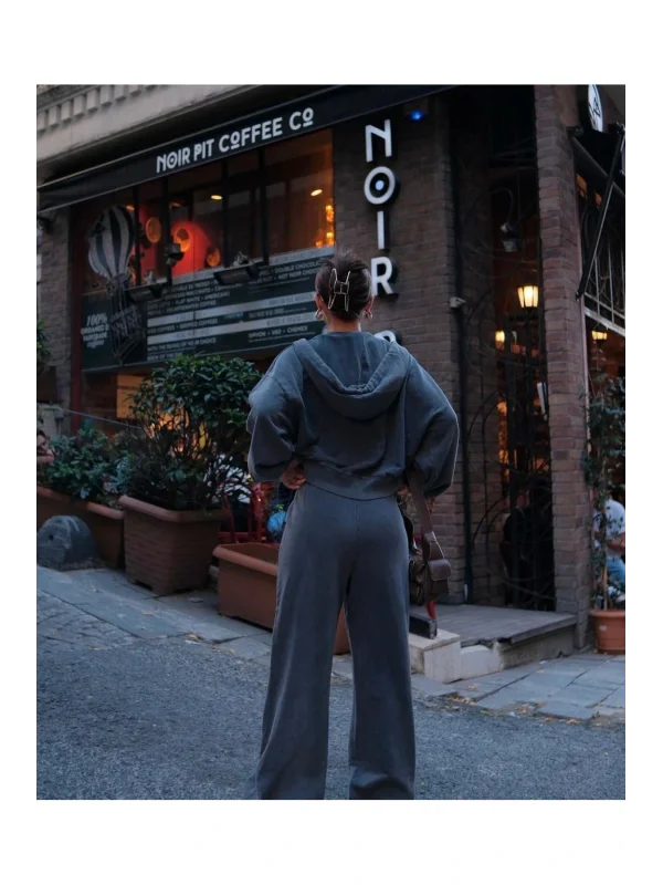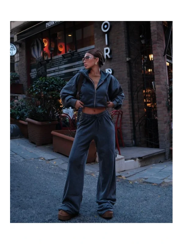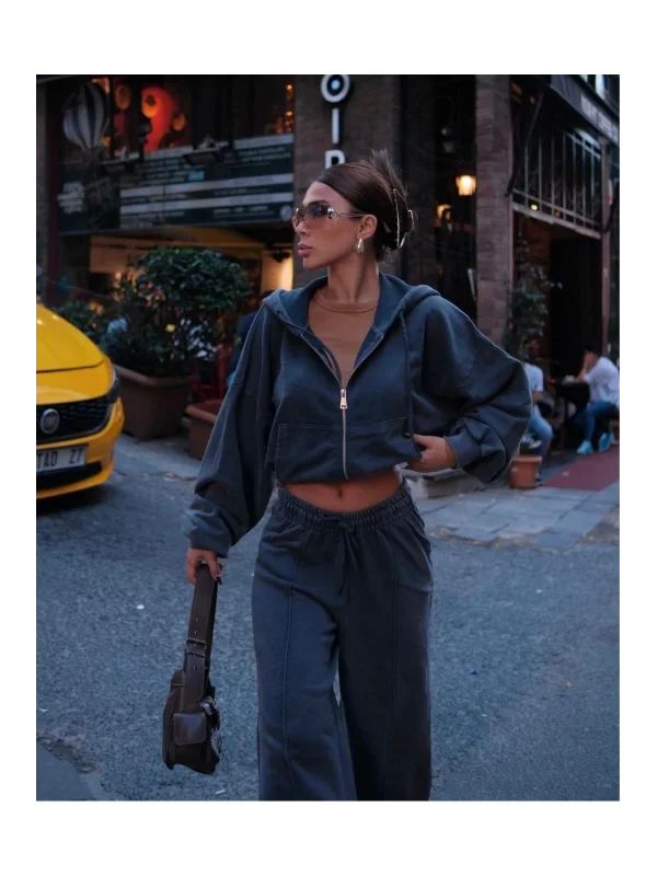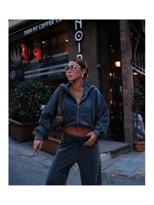 VibeGaia Yıkamalı Kapüşonlu Crop Eşofman Takımı