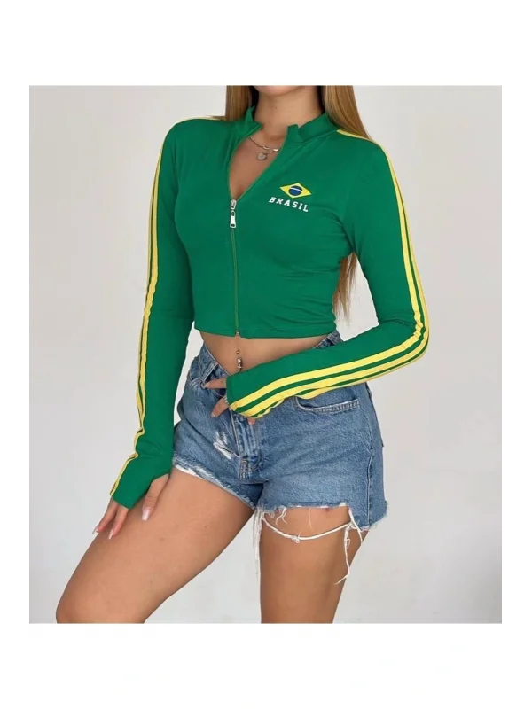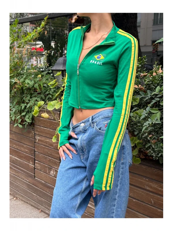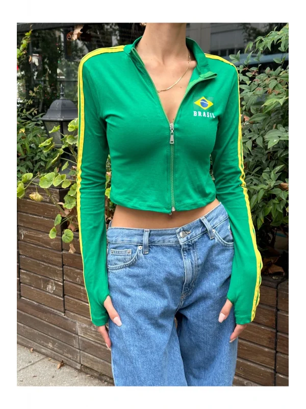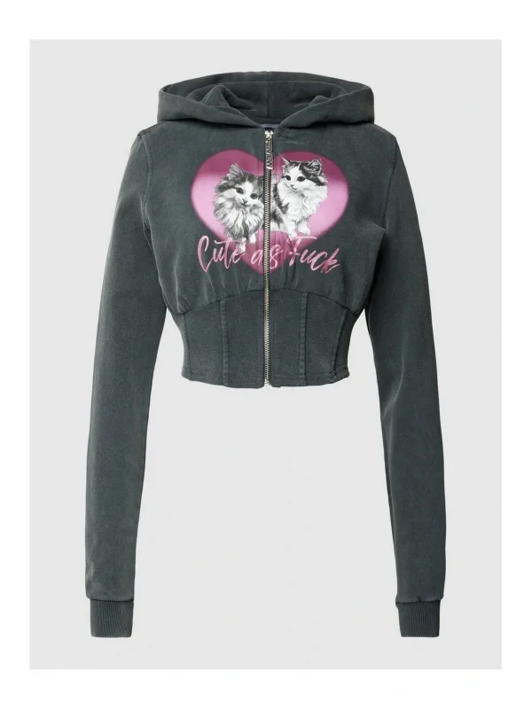 Retro Kedili Fermuarlı Crop Sweatshirt