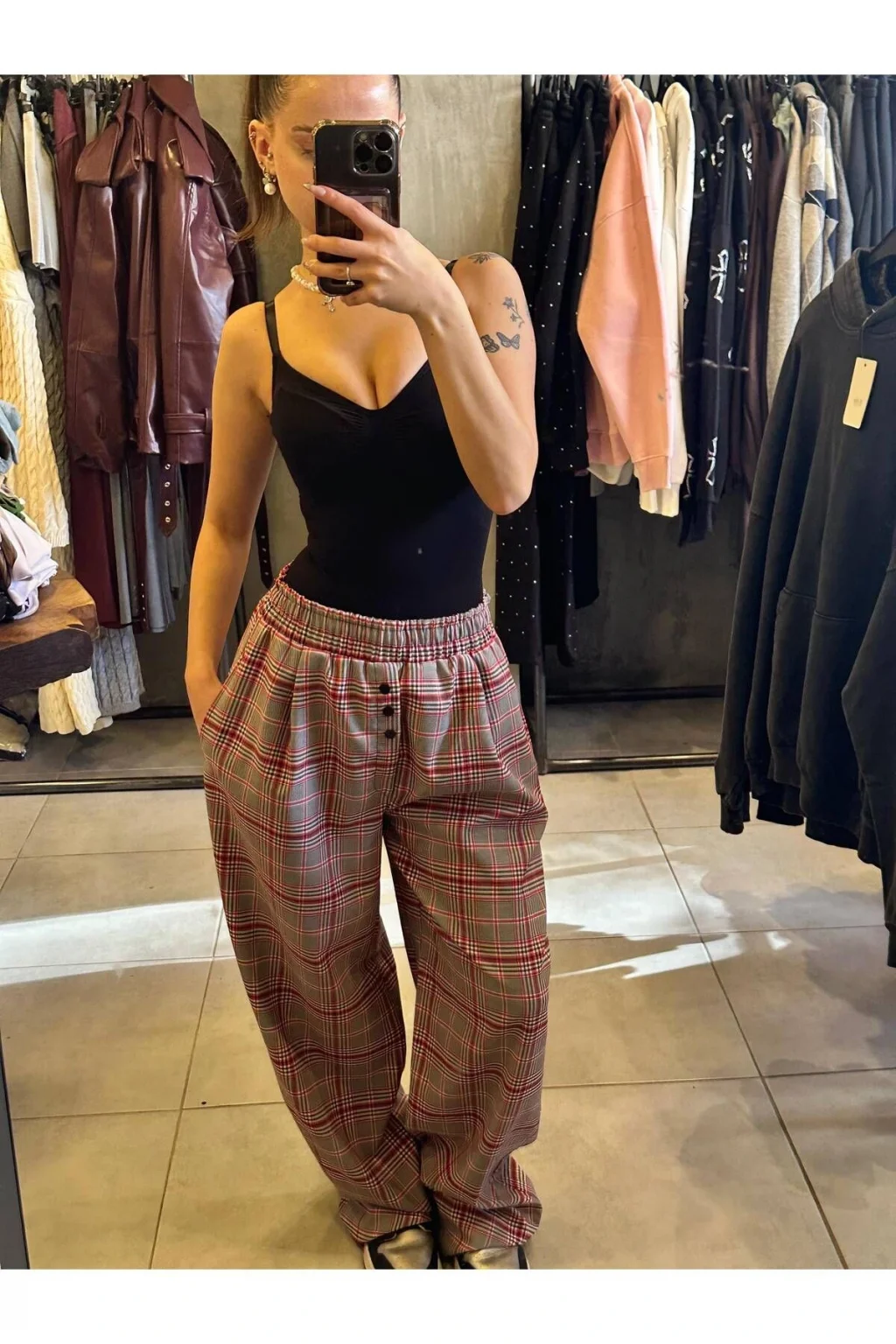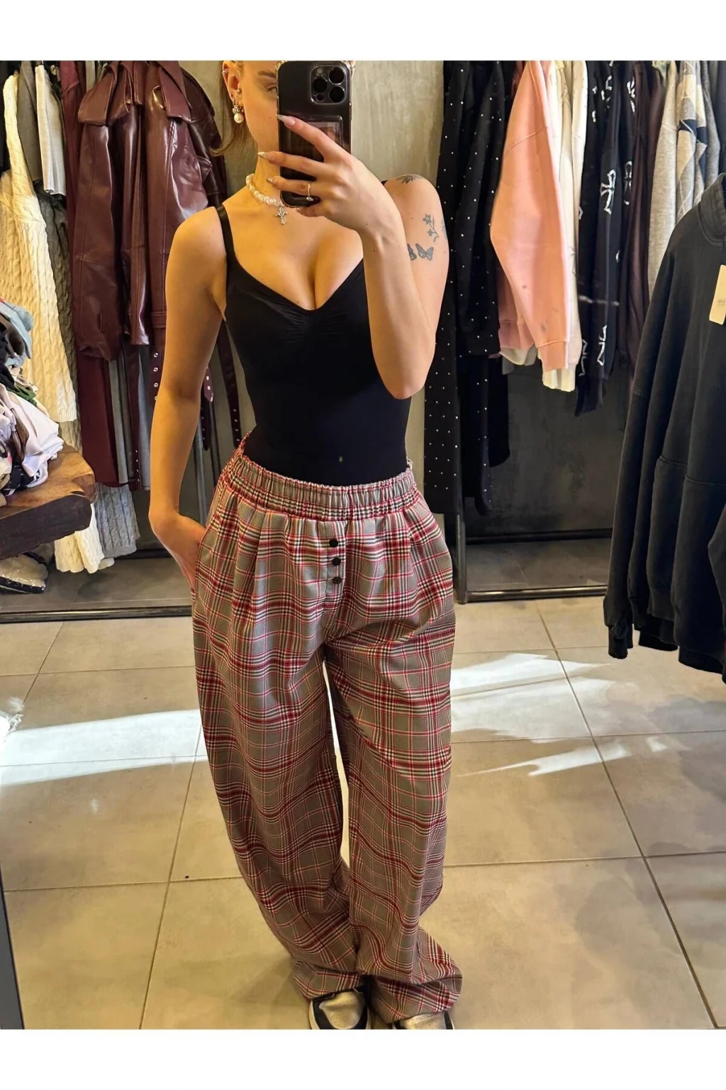 Ürünümüzün boyu: 110 cm ; Modelin bedeni: 36 ; Unisextir.; ; Gri Kırmızı Unisex Kareli Pijama Altı ;