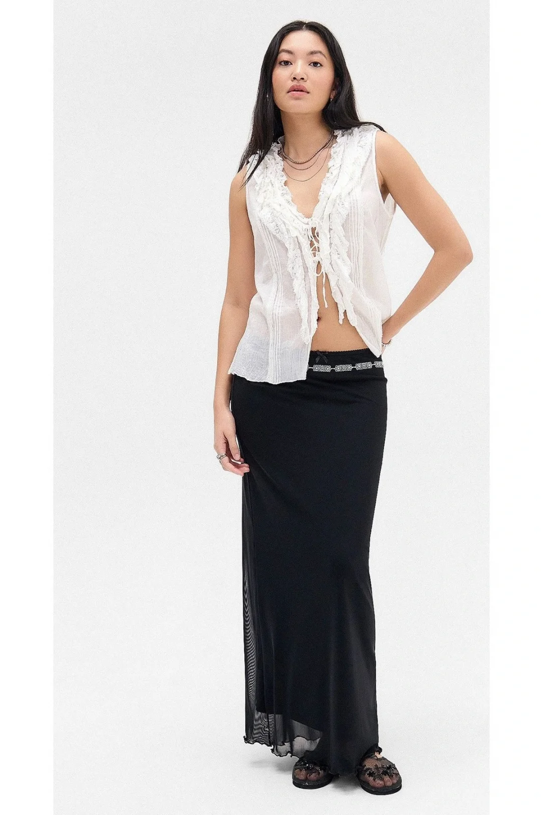 Retro Beyaz Uzun Panelli Bağcıklı Pamuk Etek Orta Bel Ayarlanabilir Elastik Bel