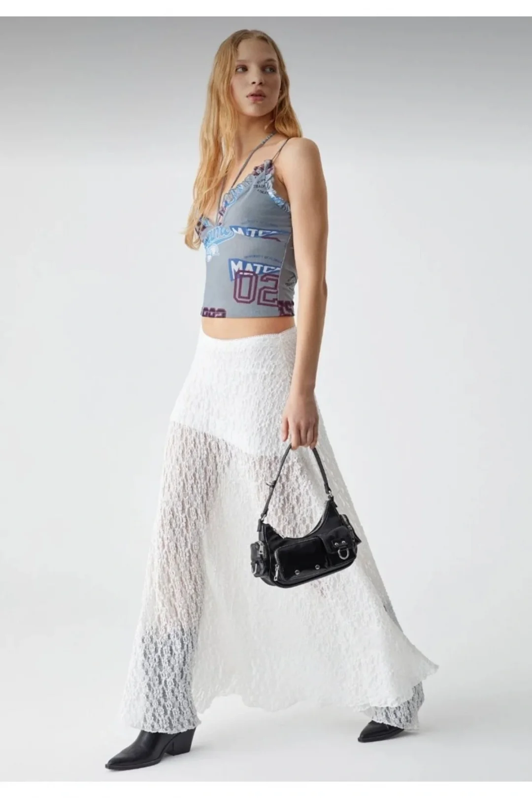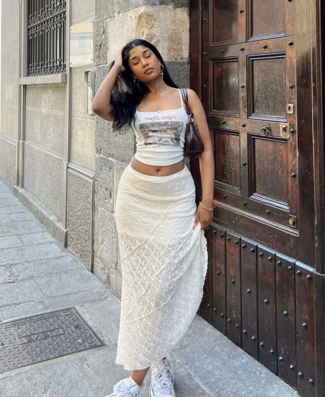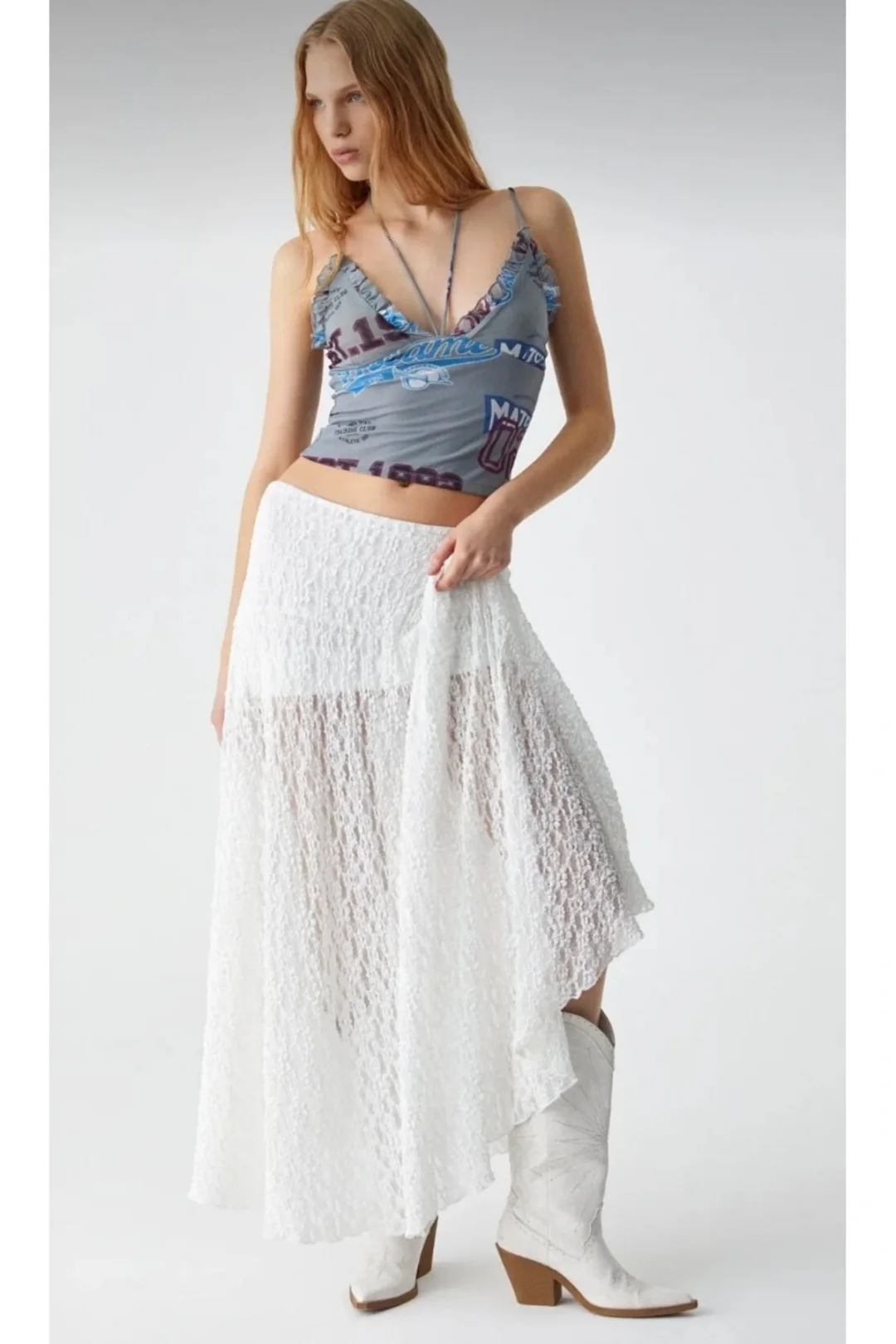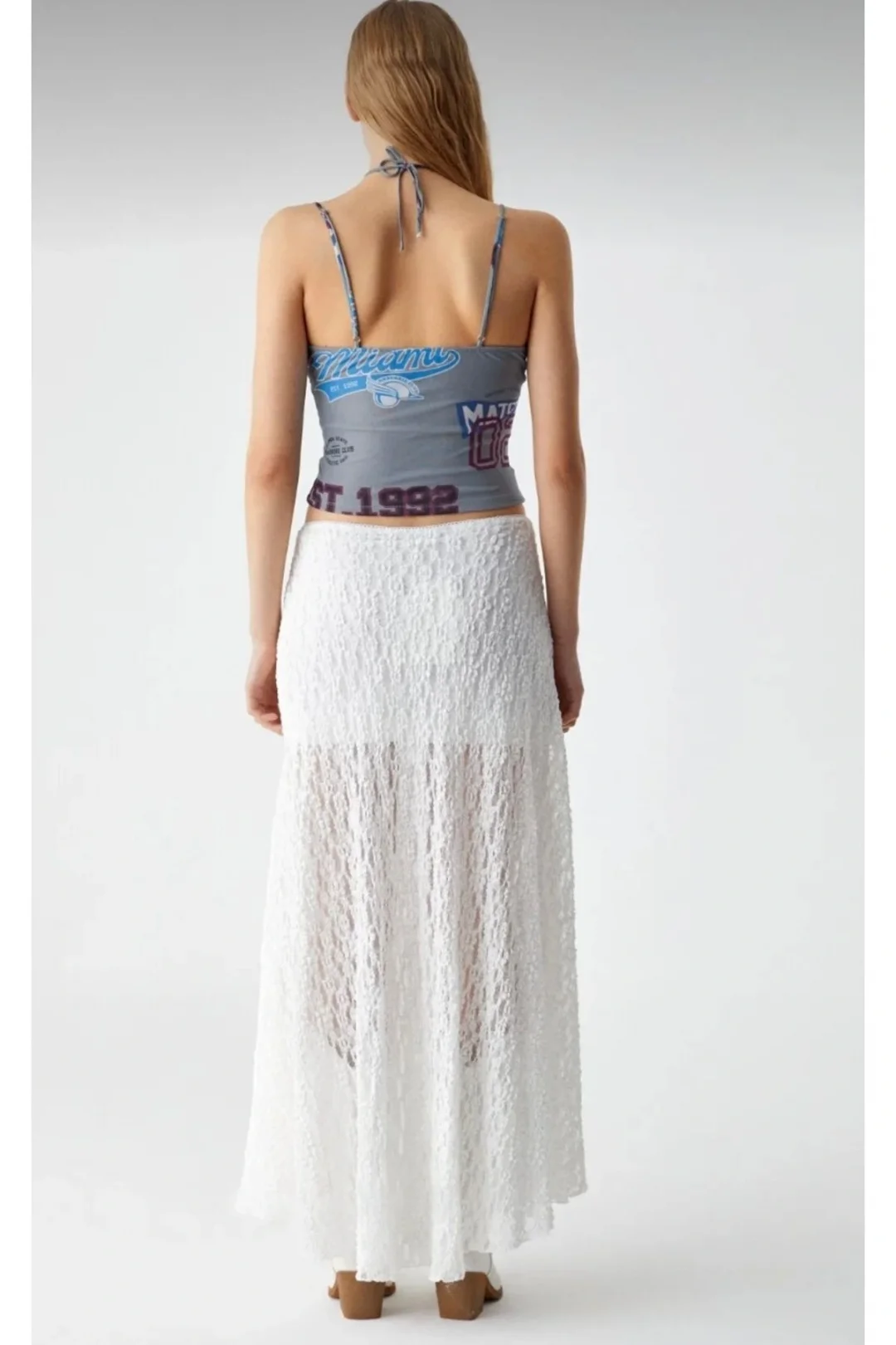Retro Beyaz Uzun Panelli Bağcıklı Pamuk Etek Orta Bel Ayarlanabilir Elastik Bel