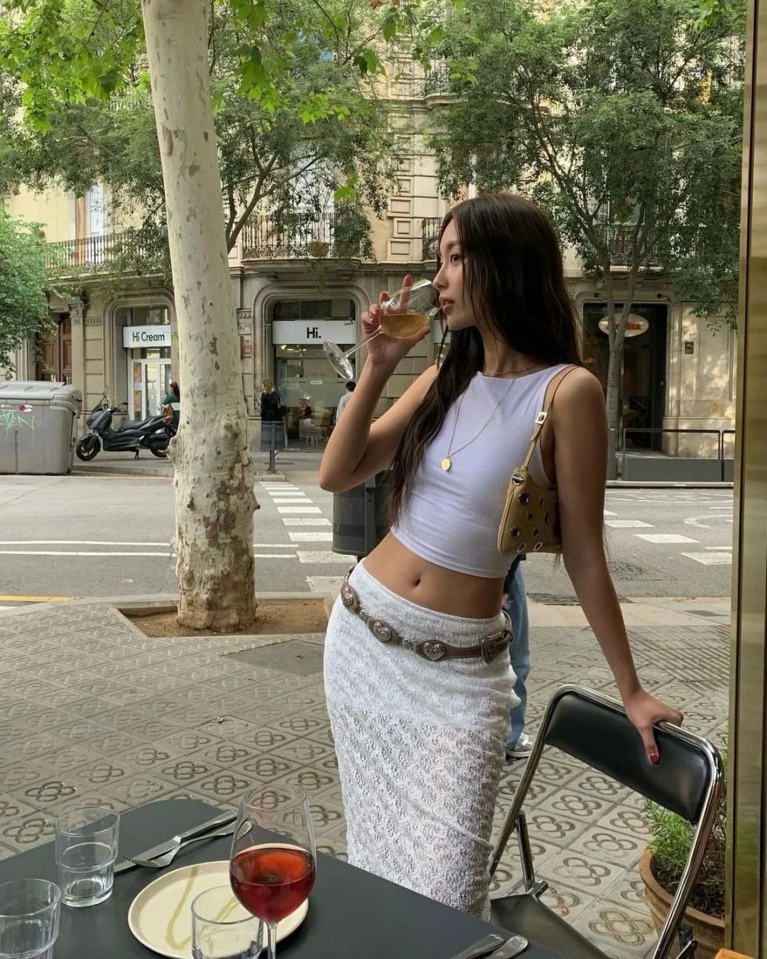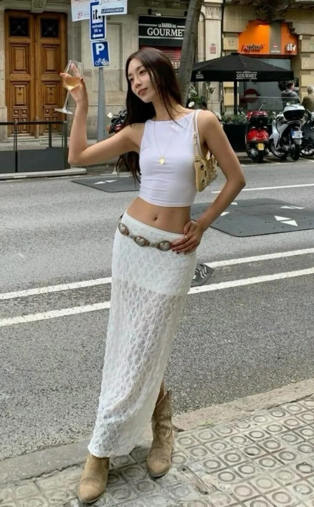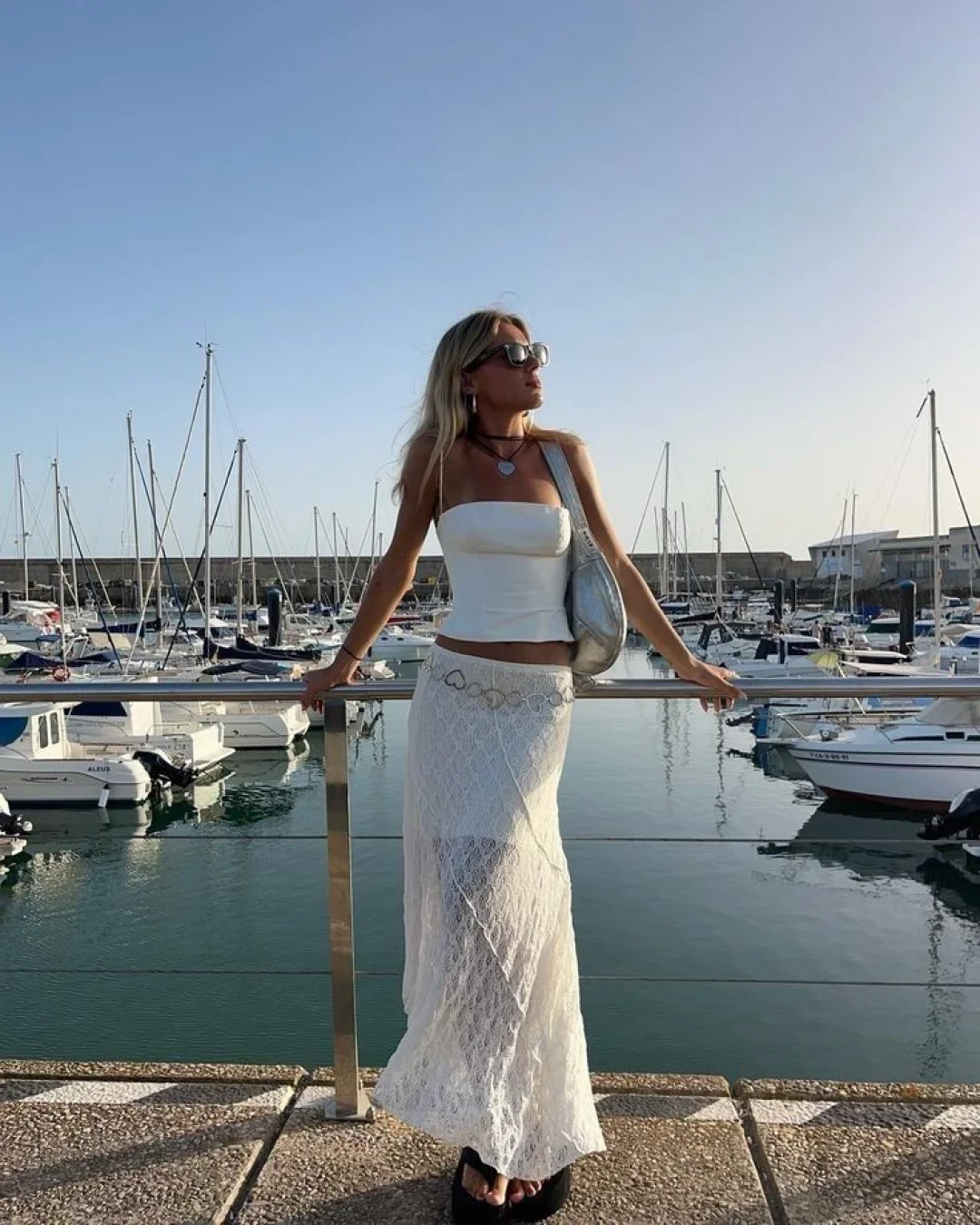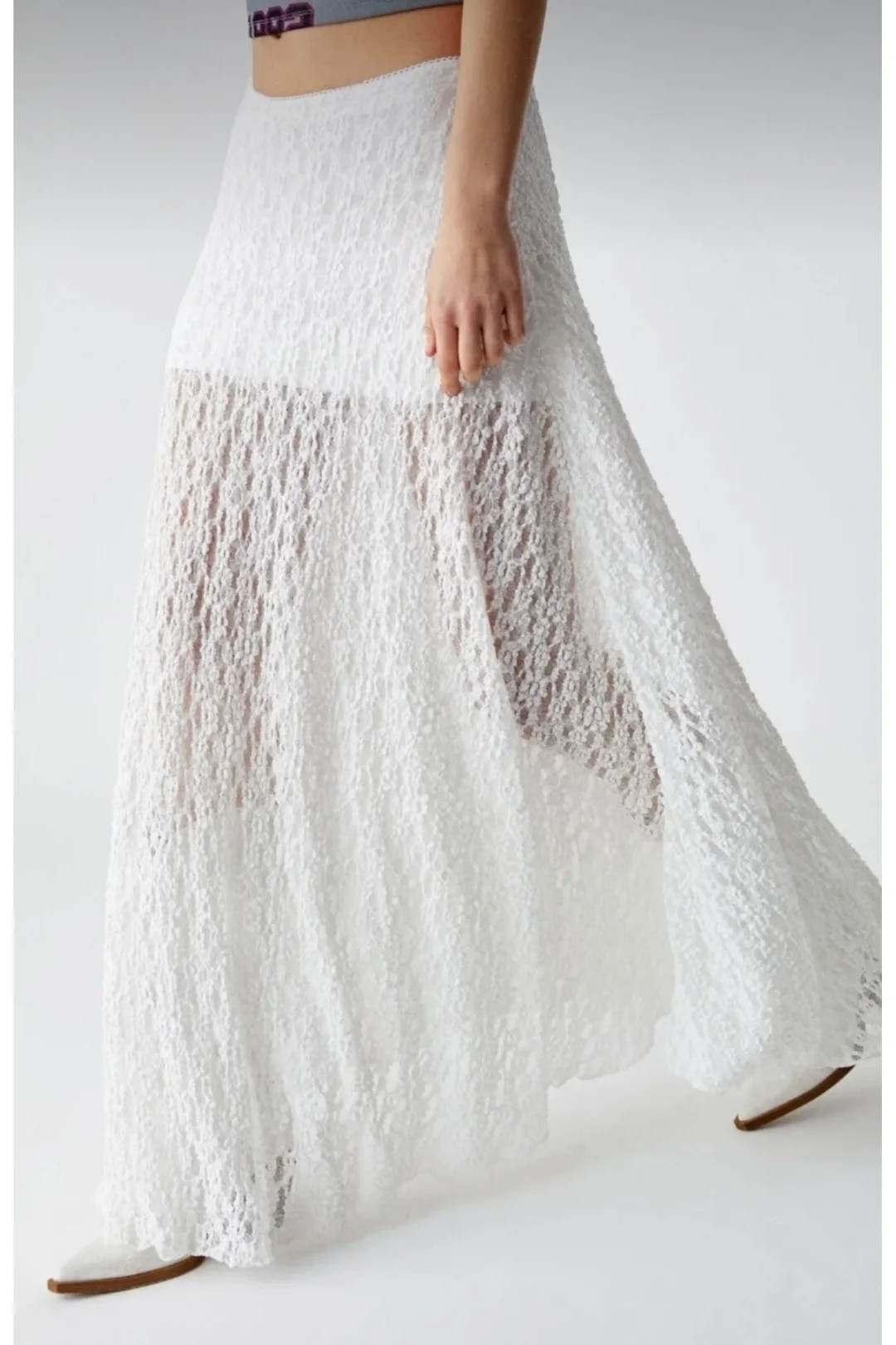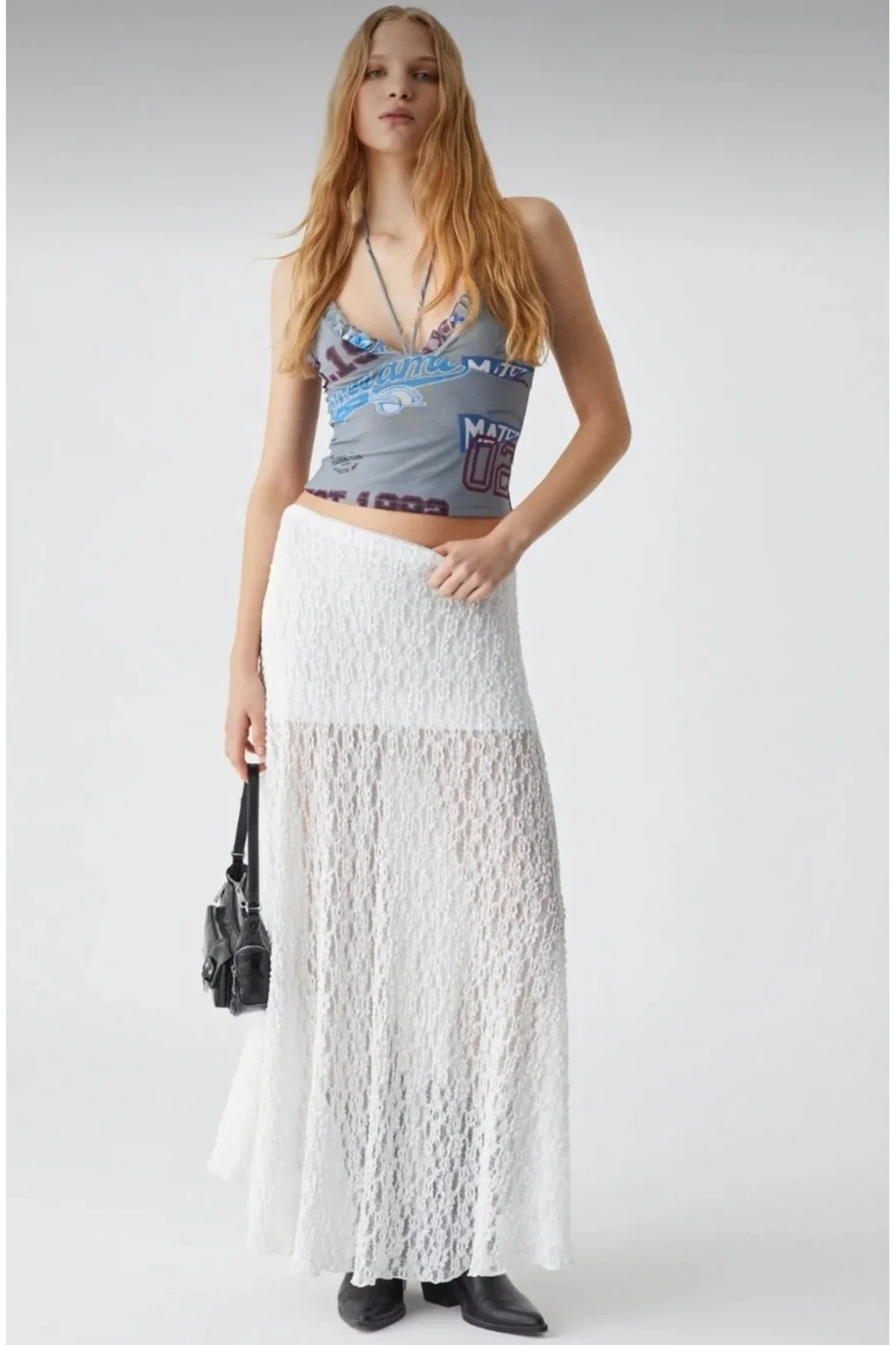 Retro Beyaz Uzun Panelli Bağcıklı Pamuk Etek Orta Bel Ayarlanabilir Elastik Bel