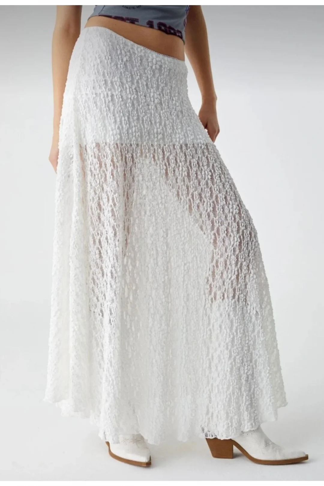 Kadın Beyaz Kırışık Dokulu Yüksek Bel Uzun Pileli Etek