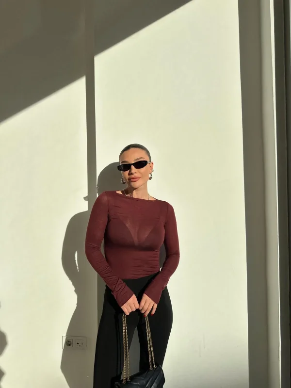 Trs Çilek Doku Kayık Yaka Bordo Transparan Bluz