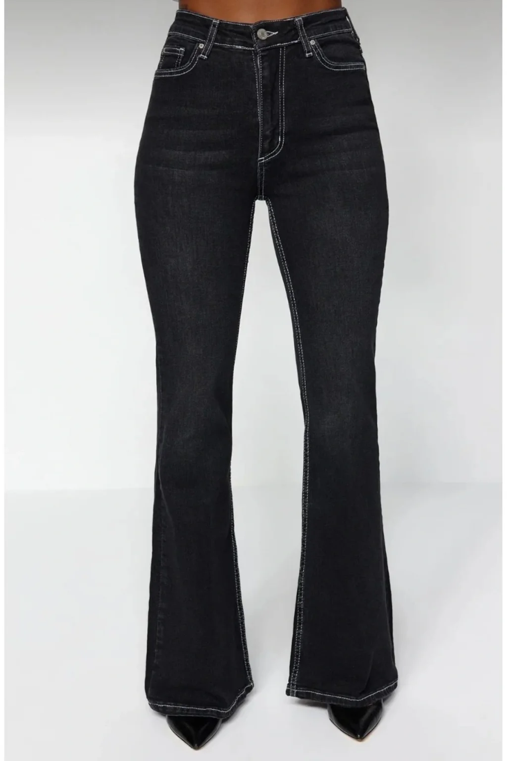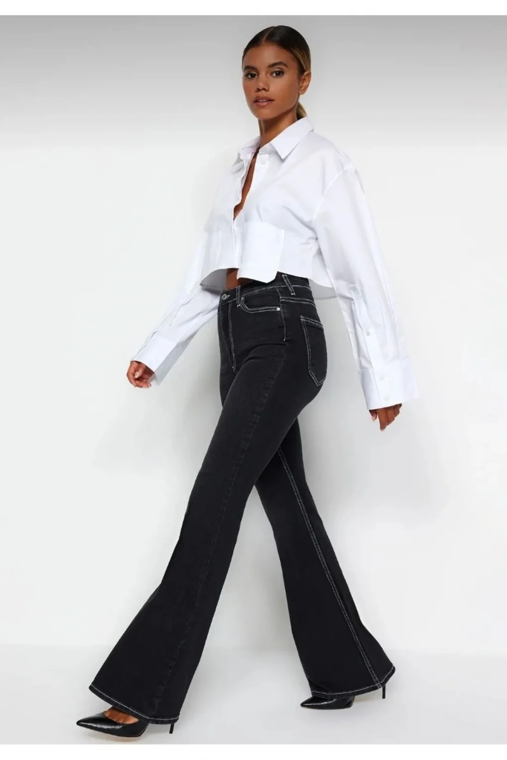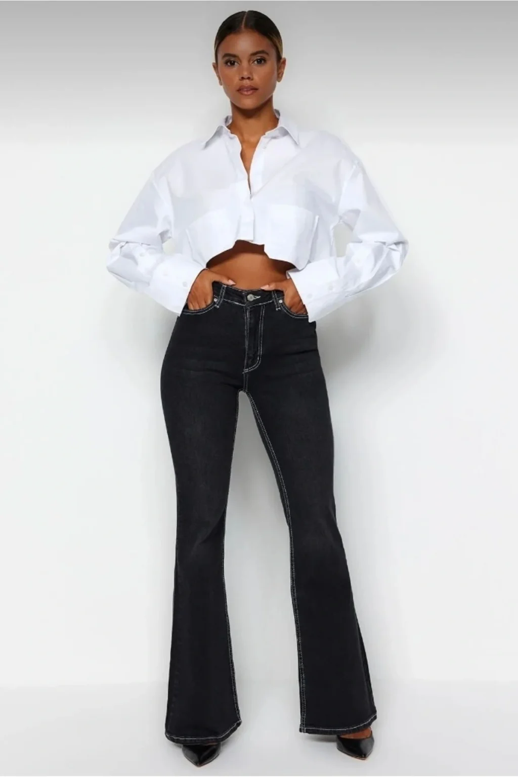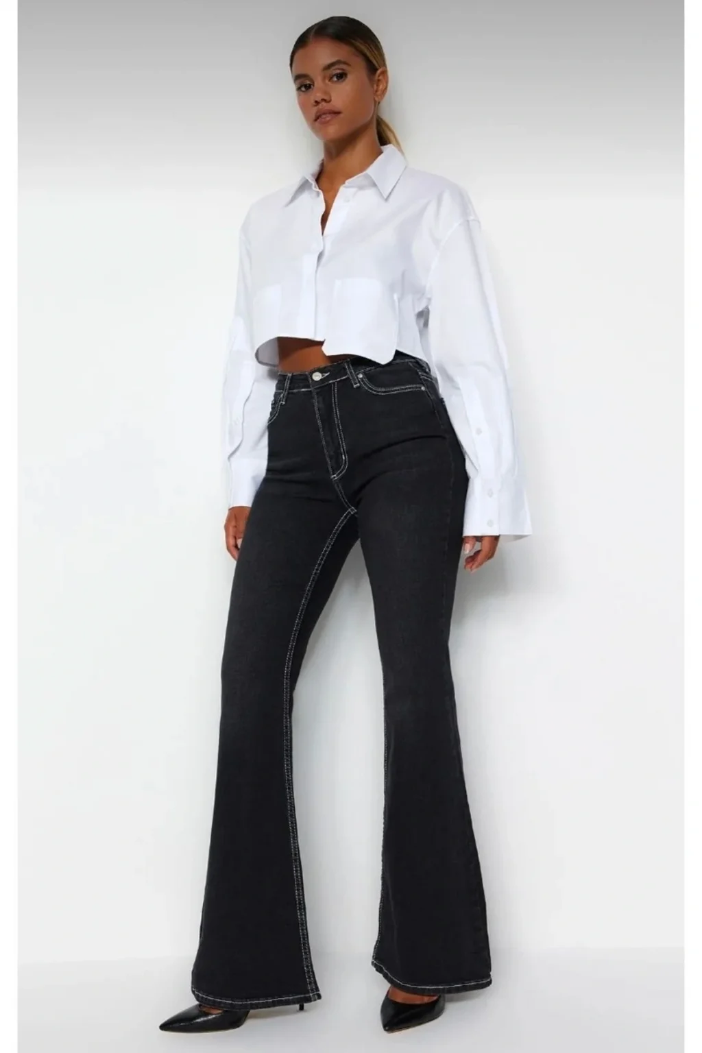 Flare Kesim Pullu Zımba Detaylı Düşük Bel Denim Jean