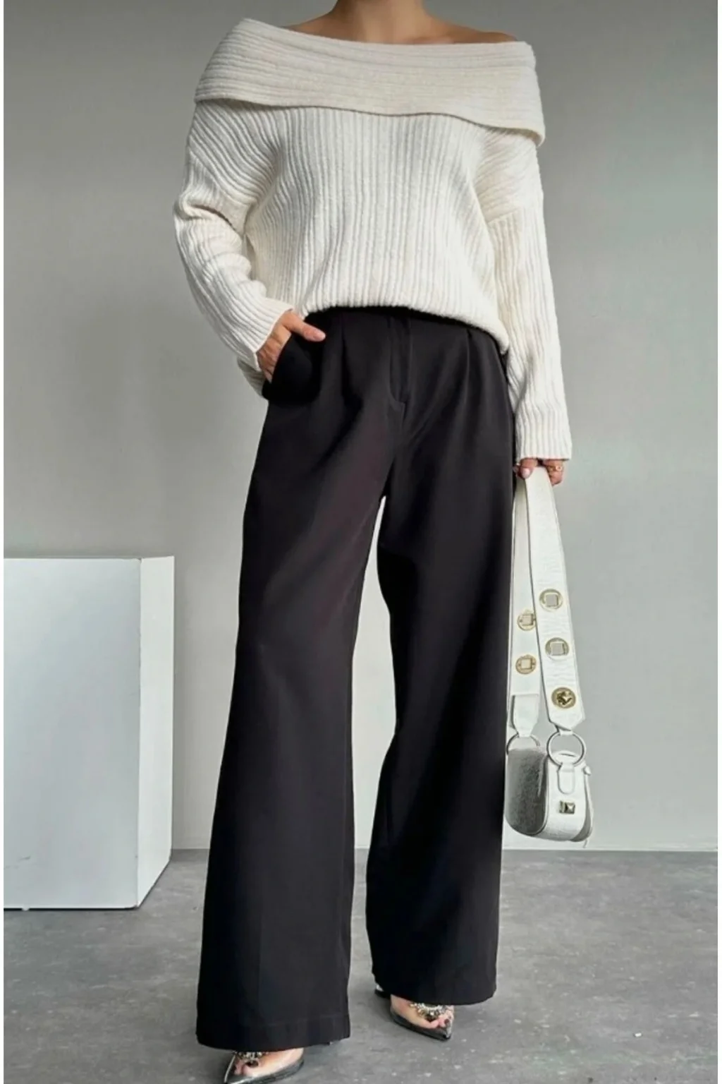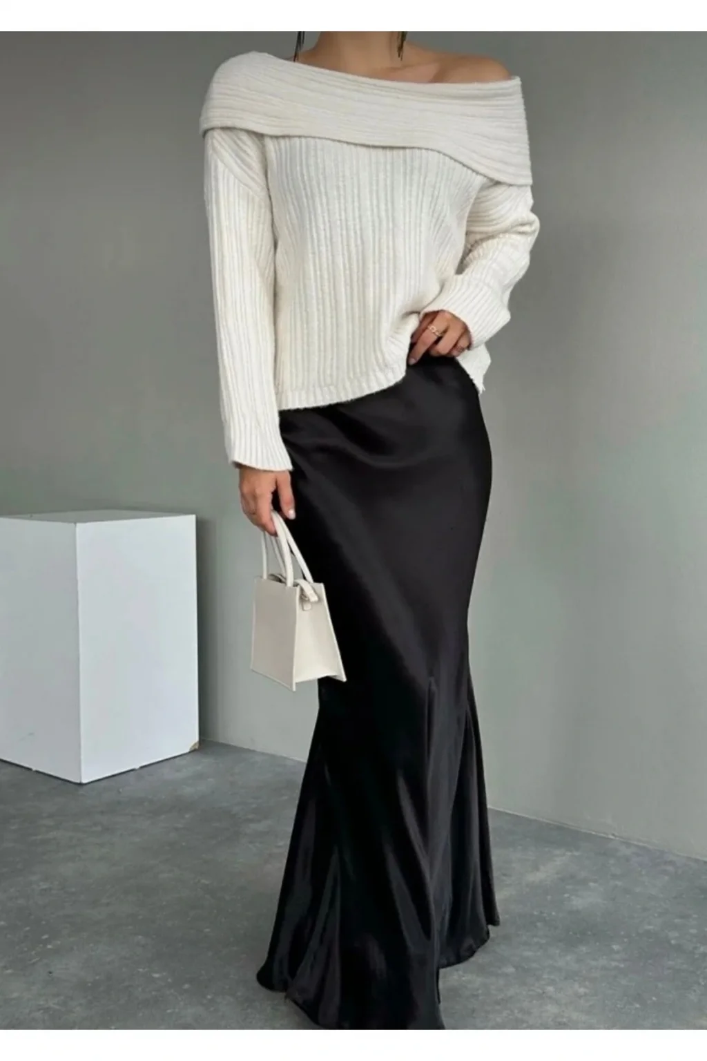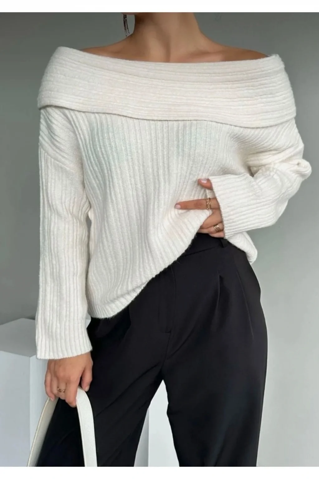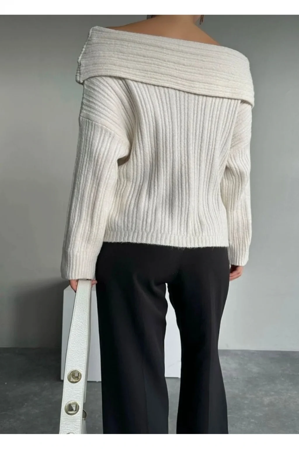 Krem Kadin Omuzları Açık Oversize Triko Kazak