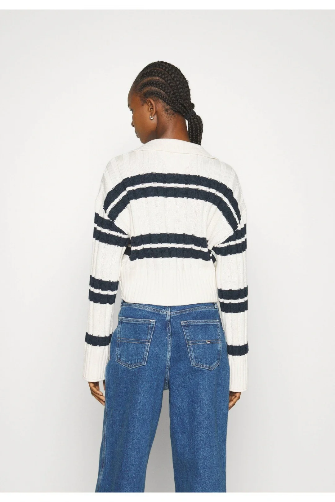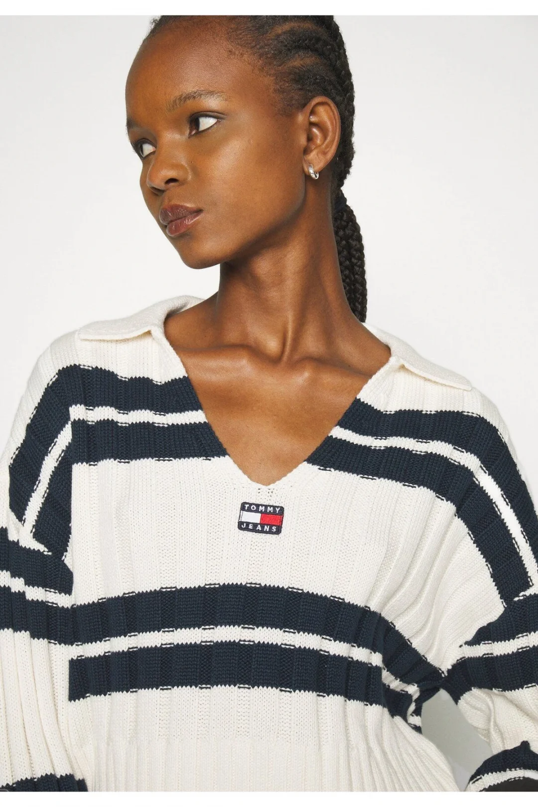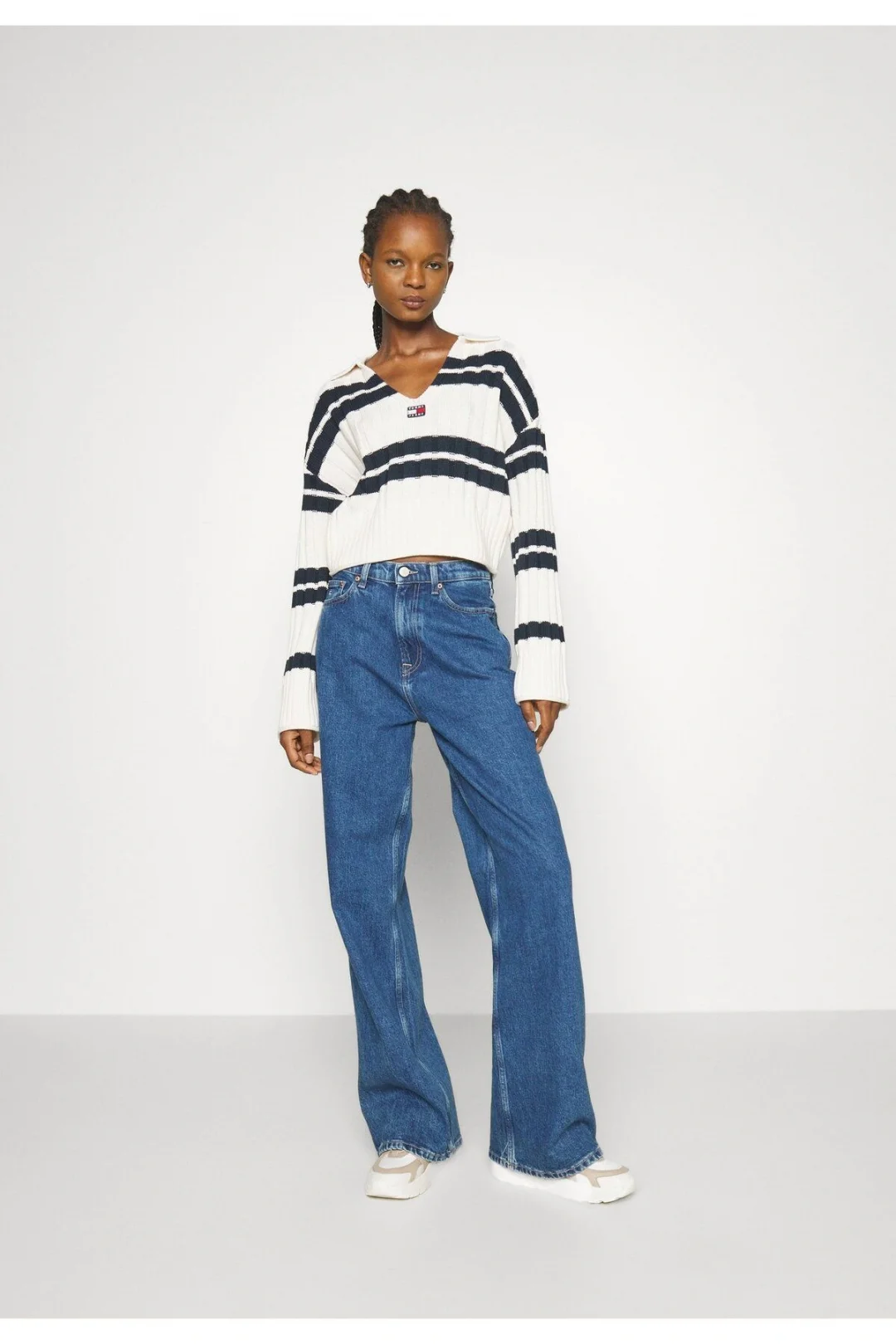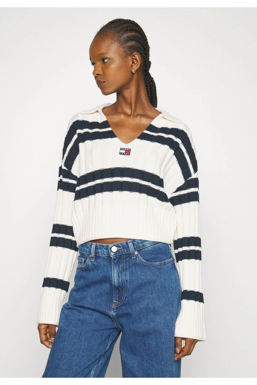 Lacivert Kayık Yaka Uzun Kollu, Rahat Fit Omzu Açık Kadın Crop Kazak