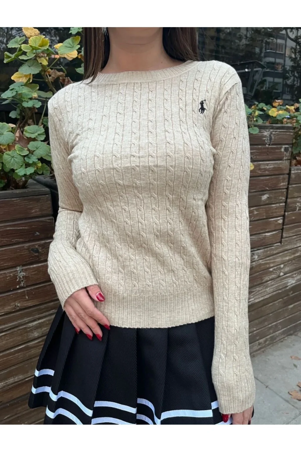 Krem Kadin Omuzları Açık Oversize Triko Kazak