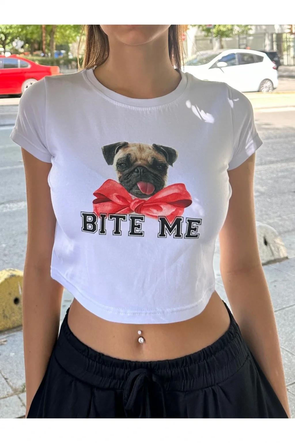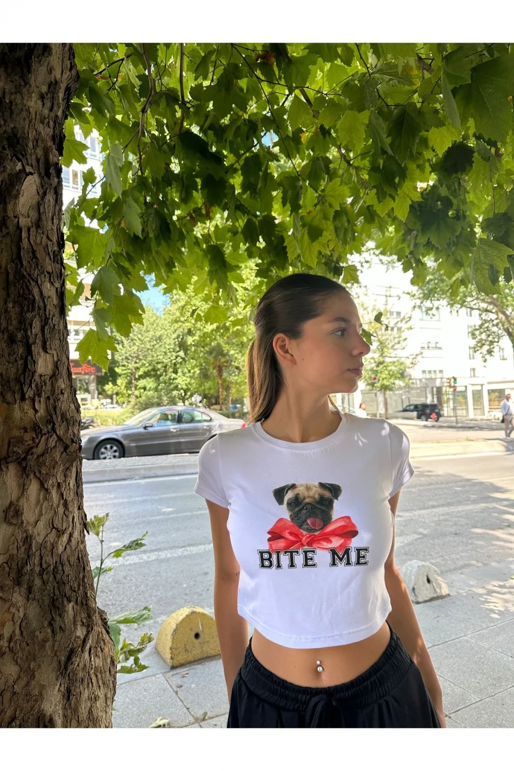 Gençlerin enerjisini yansıtan Y2K dog bıte me baskısıyla tasarlanmış, trendleri yakından takip eden crop top.; Askılı yapısı ile yaz ayları için ideal olan bu t-shirt, serinlik ve konfor sunar.; Penye kumaşı sayesinde hafif ve nefes alabilen yapısıyla gün boyu rahat etmenizi sağlar.; Canlı ve dikkat çekici dog bıte me baskısıyla stilinizi öne çıkaracak bir görünüm kazandırır.; Crop silueti modern ve trend bir stil sunarken, slim fit kalıbı vücut hatlarınıza mükemmel oturur.; Her yaş grubundan insanın rahatlıkla kullanabileceği bu t-shirt, genç enerjisini yansıtırken her ortamda fark edilmenizi sağlar.;