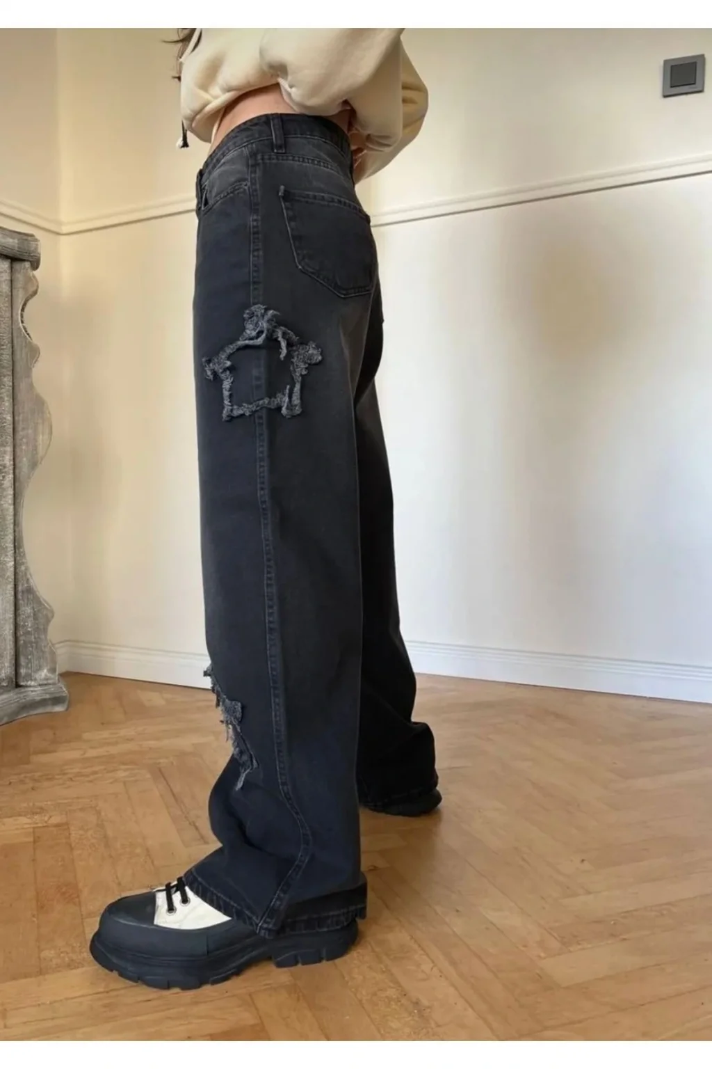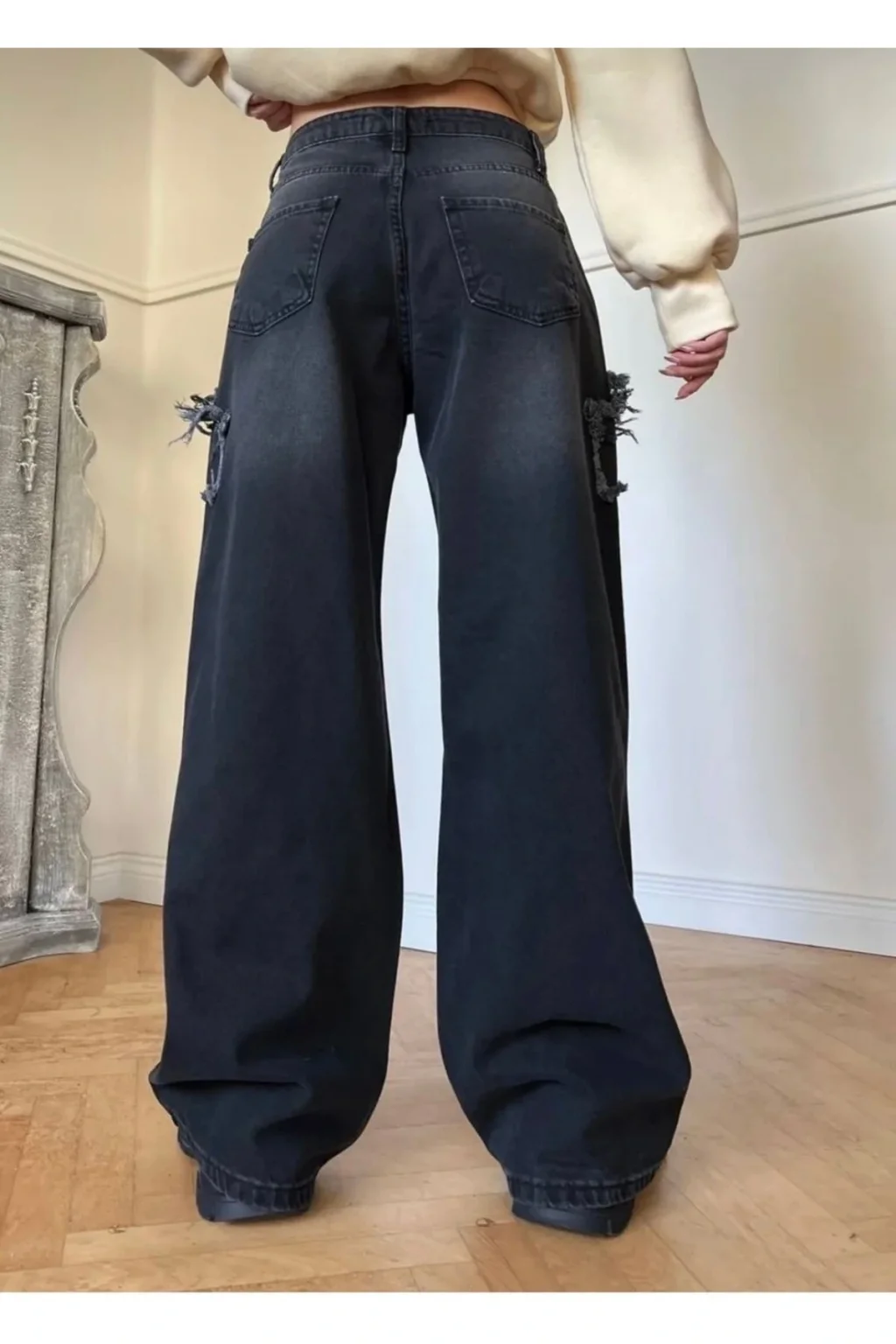 Y2K Vintage Retro Eskitme Süper Arka Cepli Düşük Bel İspanyol Paça Jean